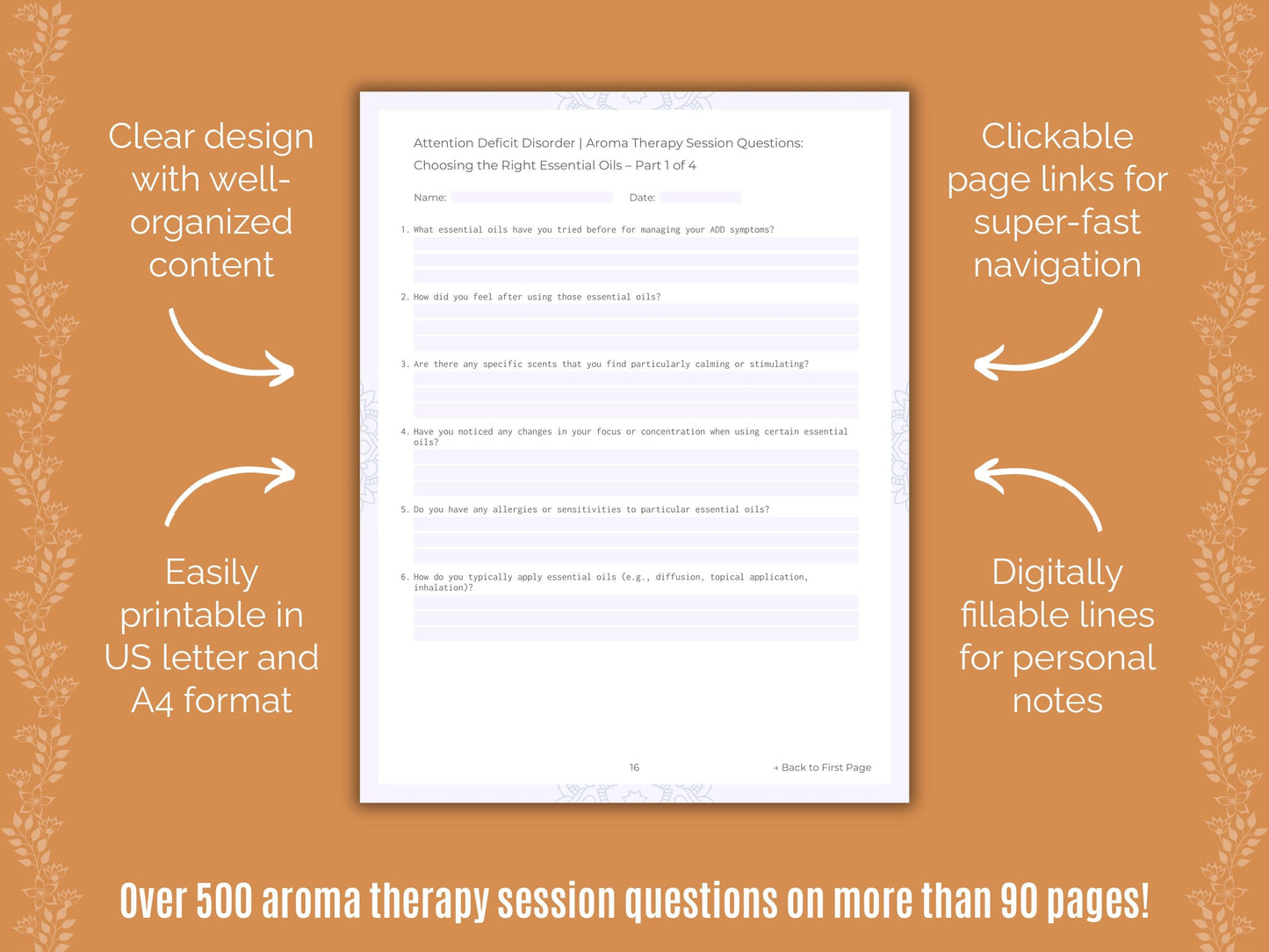 📚 Contains: One PDF workbook with over 500 aroma therapy session questions for ADD therapy in 22 sections, instantly downloadable in US letter and A4 size.