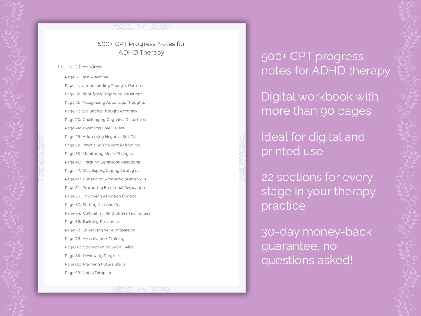 📚 Contains: One PDF workbook with over 500 cognitive processing therapy (CPT) progress notes for ADHD therapy in 22 sections, instantly downloadable in US letter and A4 size.