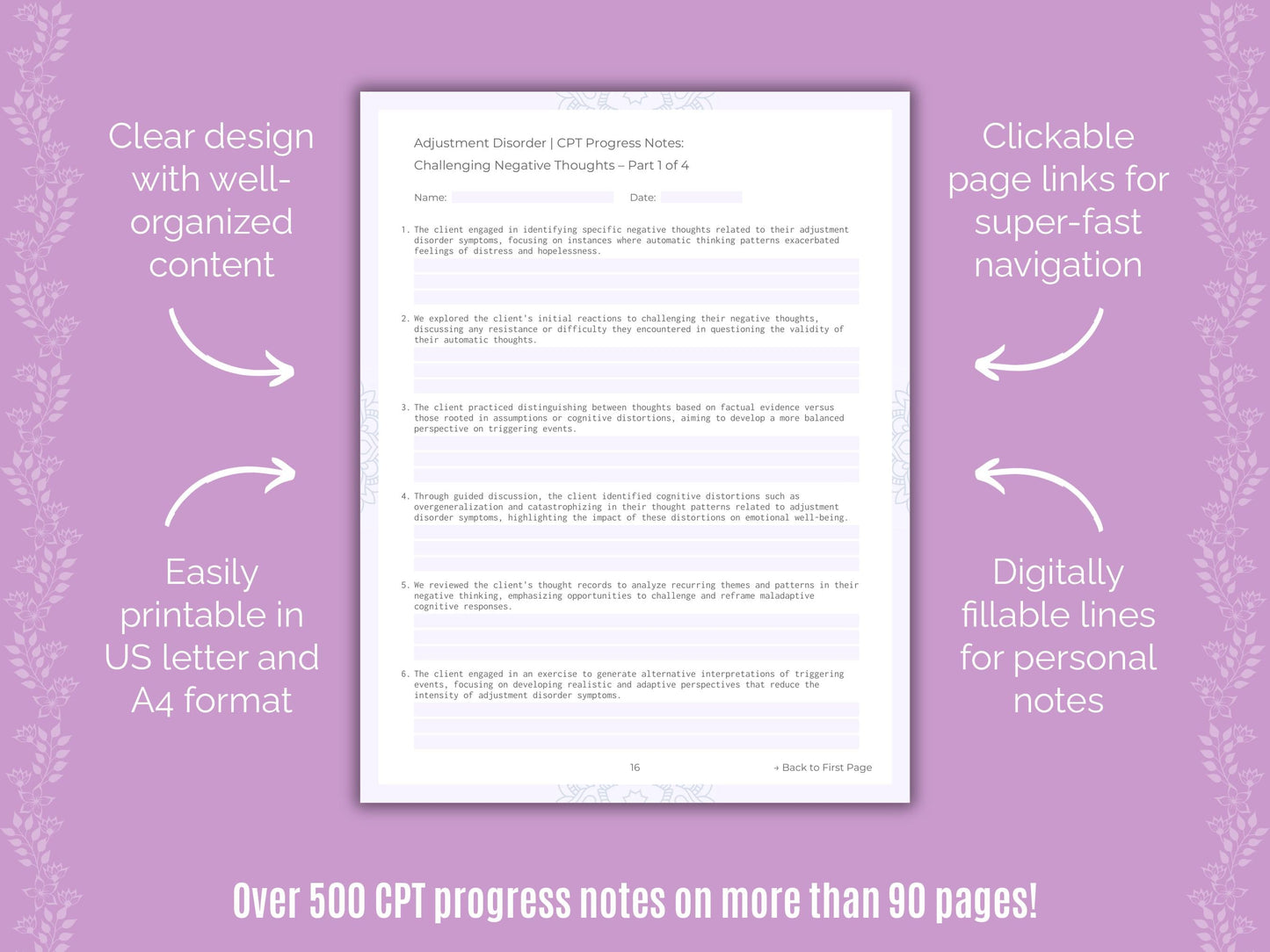 📚 Contains: One PDF workbook with over 500 cognitive processing therapy (CPT) progress notes for adjustment disorder therapy in 22 sections, instantly downloadable in US letter and A4 size.