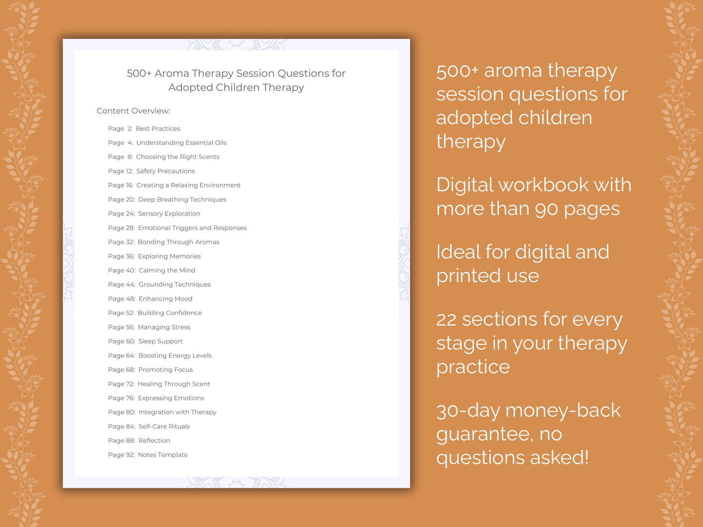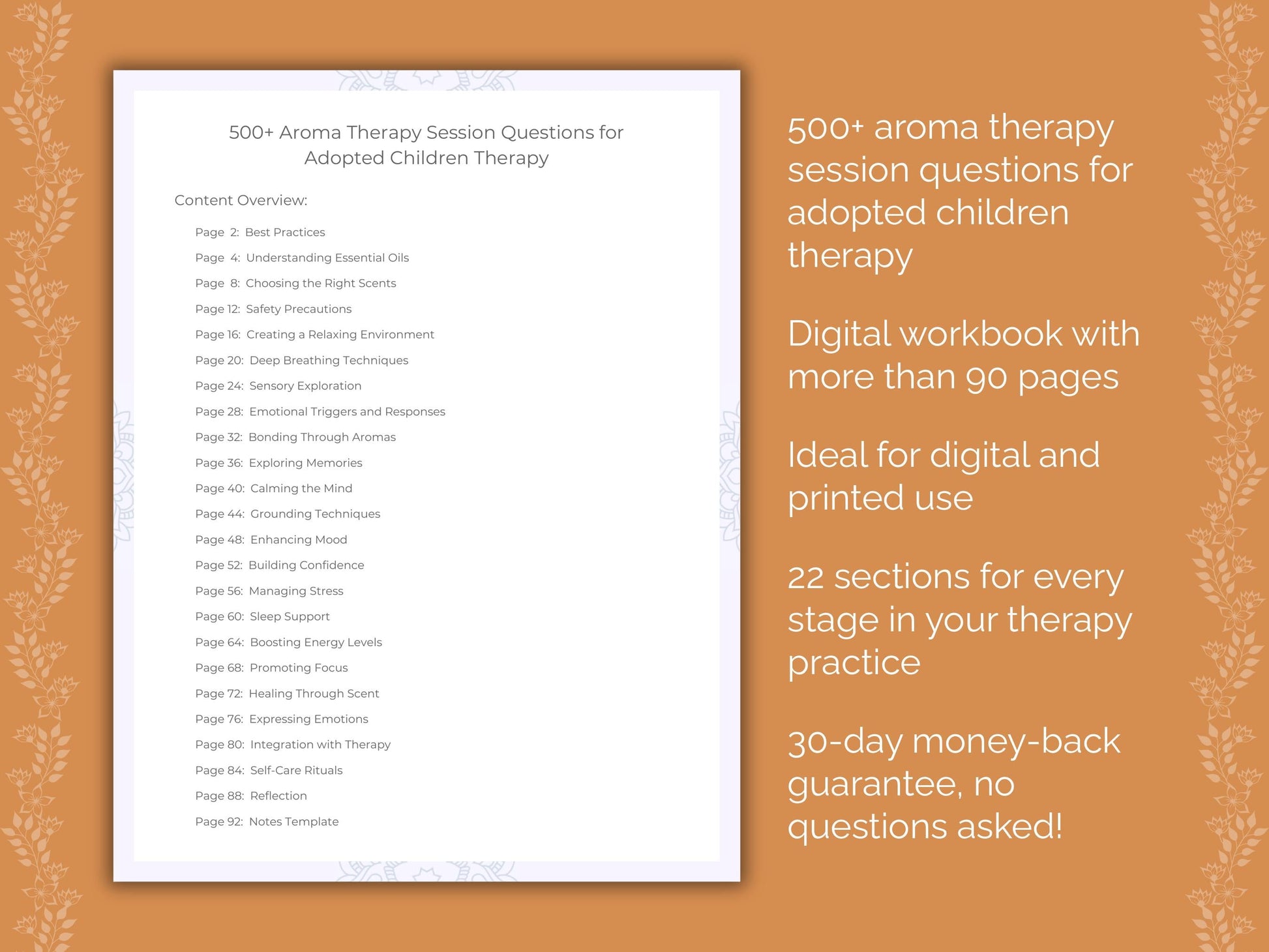 📚 Contains: One PDF workbook with over 500 aroma therapy session questions for adopted children therapy in 22 sections, instantly downloadable in US letter and A4 size.