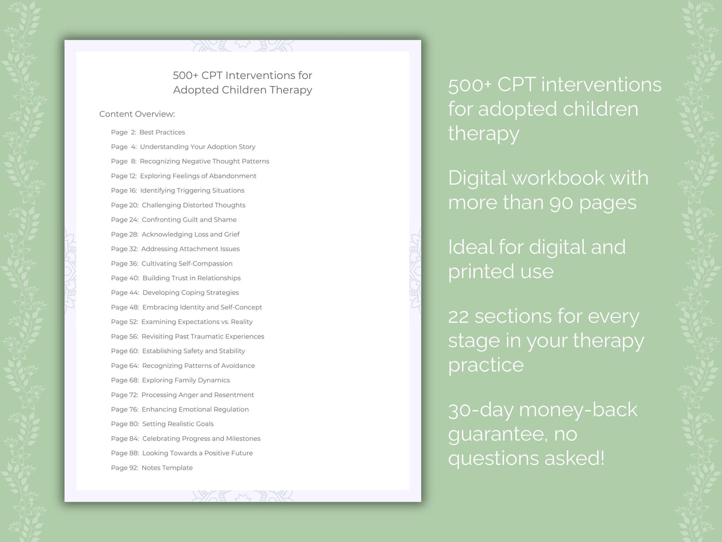 📚 Contains: One PDF workbook with over 500 cognitive processing therapy (CPT) interventions for adopted children therapy in 22 sections, instantly downloadable in US letter and A4 size.