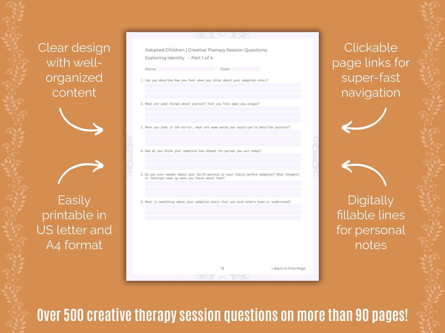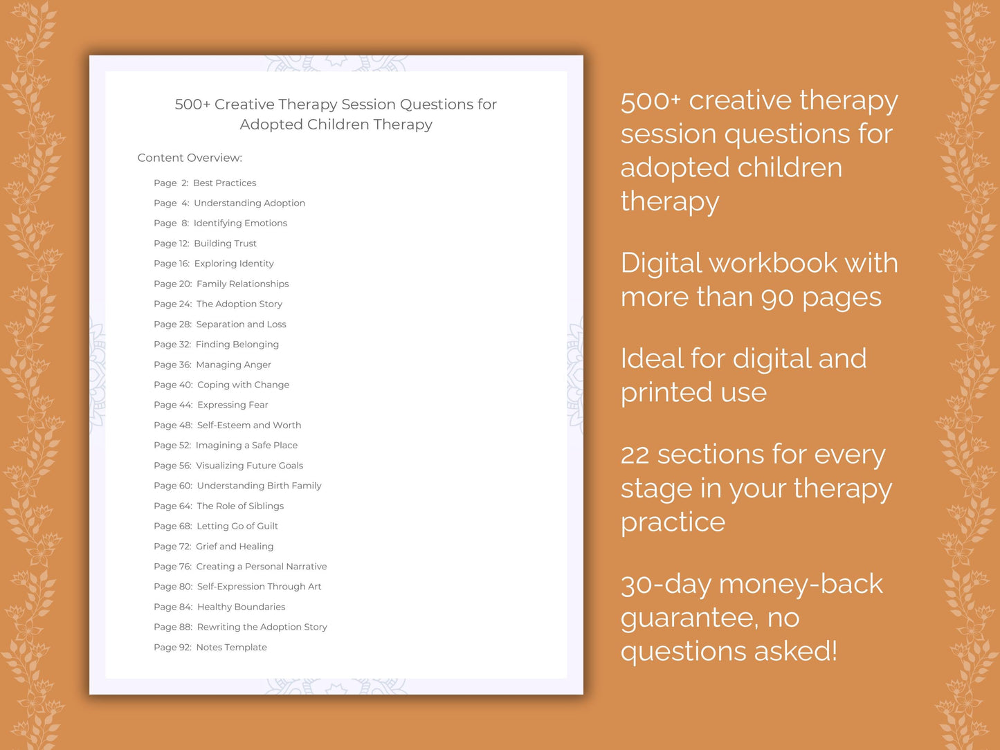 📚 Contains: One PDF workbook with over 500 creative therapy session questions for adopted children therapy in 22 sections, instantly downloadable in US letter and A4 size.