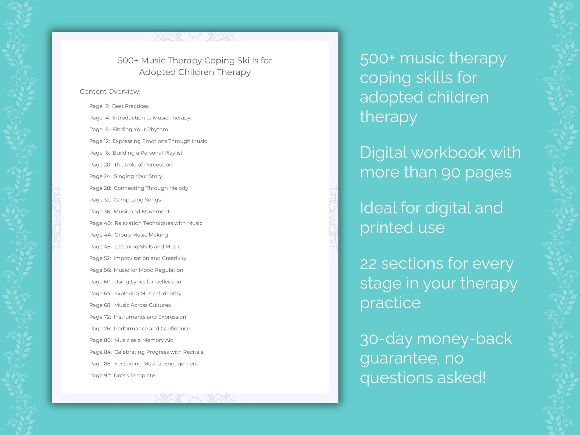 📚 Contains: One PDF workbook with over 500 music therapy coping skills for adopted children therapy in 22 sections, instantly downloadable in US letter and A4 size.