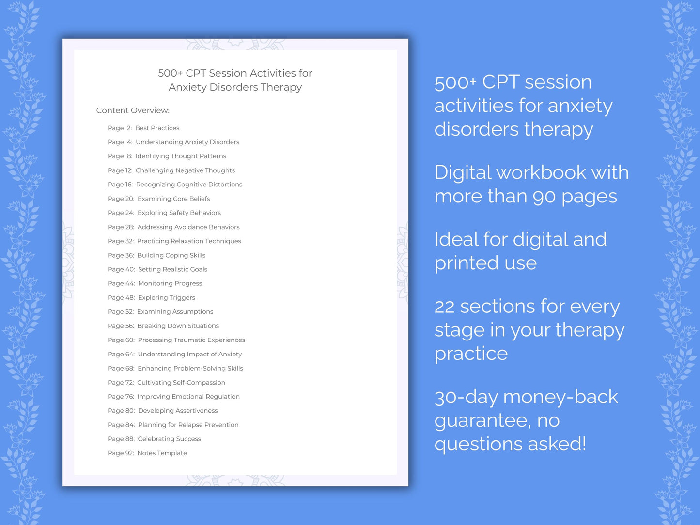 📚 Contains: One PDF workbook with over 500 cognitive processing therapy (CPT) session activities for anxiety disorders therapy in 22 sections, instantly downloadable in US letter and A4 size.