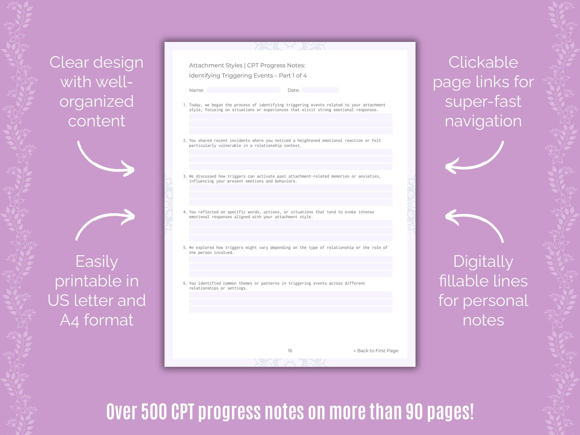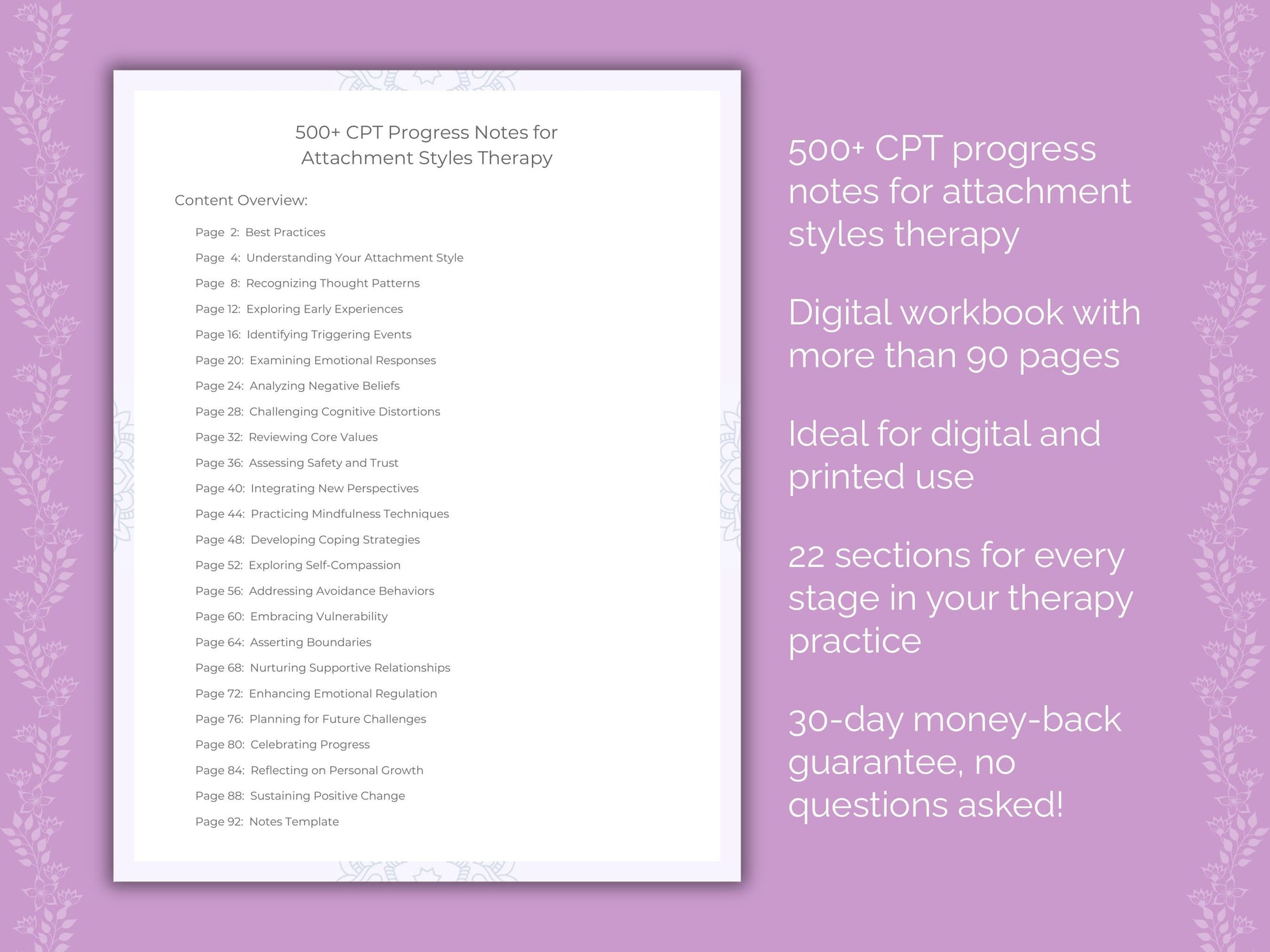 📚 Contains: One PDF workbook with over 500 cognitive processing therapy (CPT) progress notes for attachment styles therapy in 22 sections, instantly downloadable in US letter and A4 size.