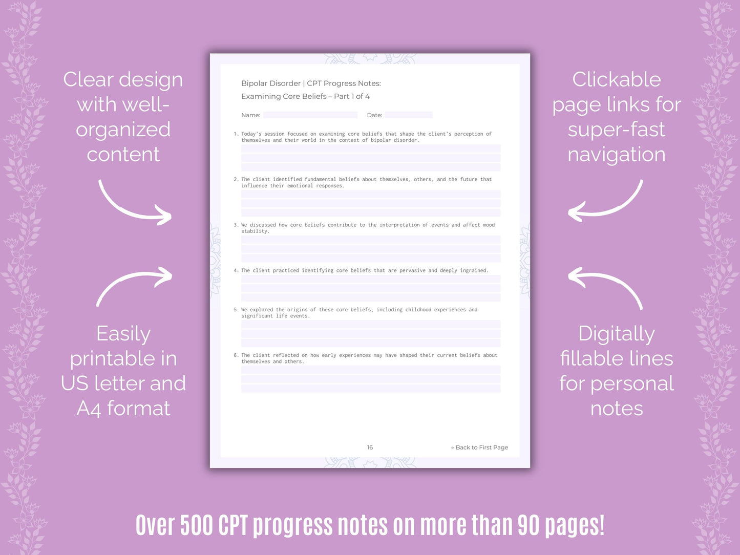 📚 Contains: One PDF workbook with over 500 cognitive processing therapy (CPT) progress notes for bipolar disorder therapy in 22 sections, instantly downloadable in US letter and A4 size.