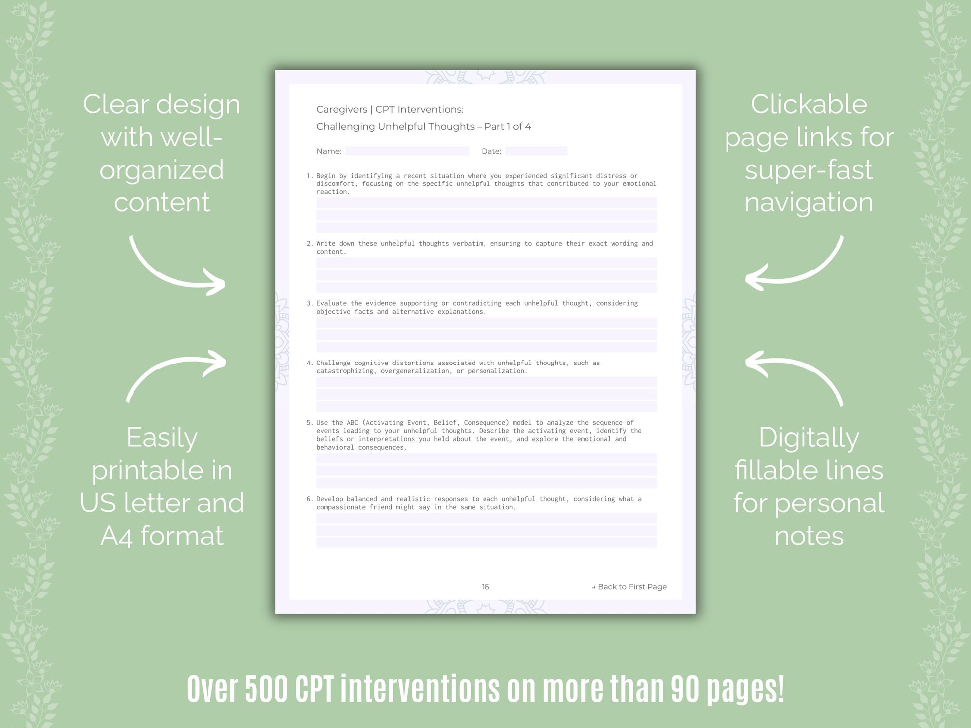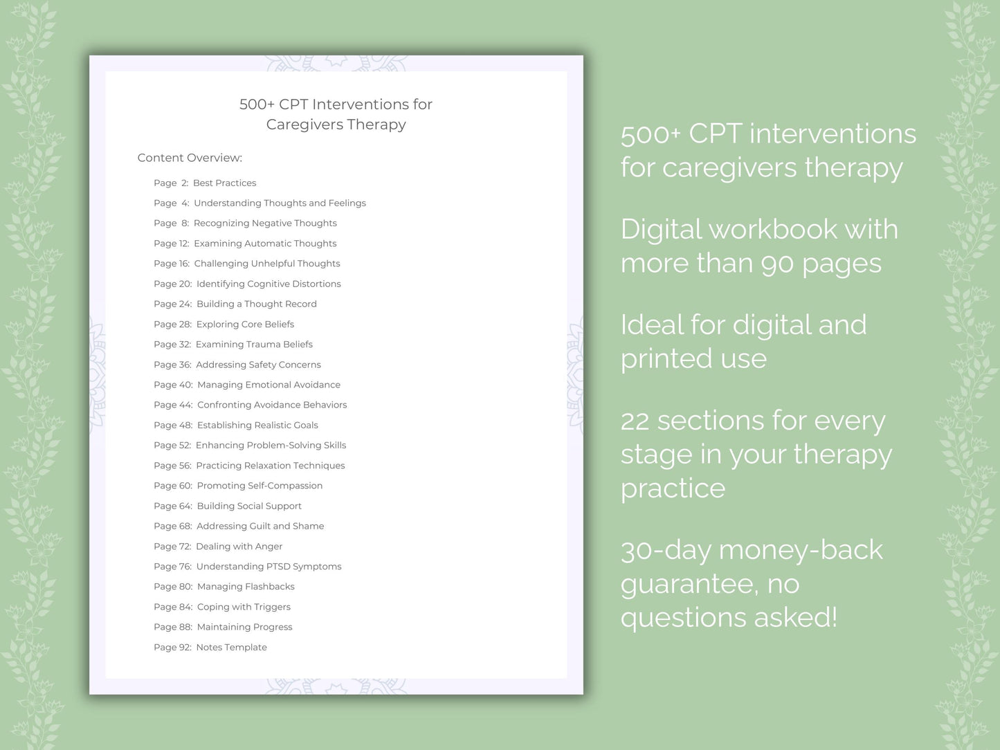 📚 Contains: One PDF workbook with over 500 cognitive processing therapy (CPT) interventions for caregivers therapy in 22 sections, instantly downloadable in US letter and A4 size.