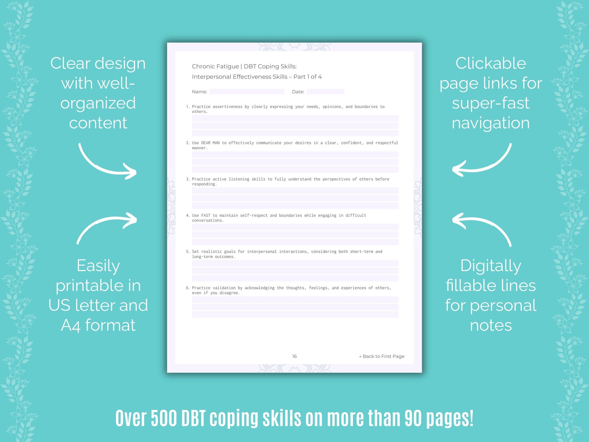 📚 Contains: One PDF workbook with over 500 dialectical behavior therapy (DBT) coping skills for chronic fatigue therapy in 22 sections, instantly downloadable in US letter and A4 size.