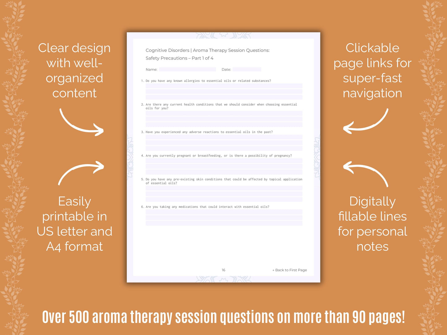 📚 Contains: One PDF workbook with over 500 aroma therapy session questions for cognitive disorders therapy in 22 sections, instantly downloadable in US letter and A4 size.