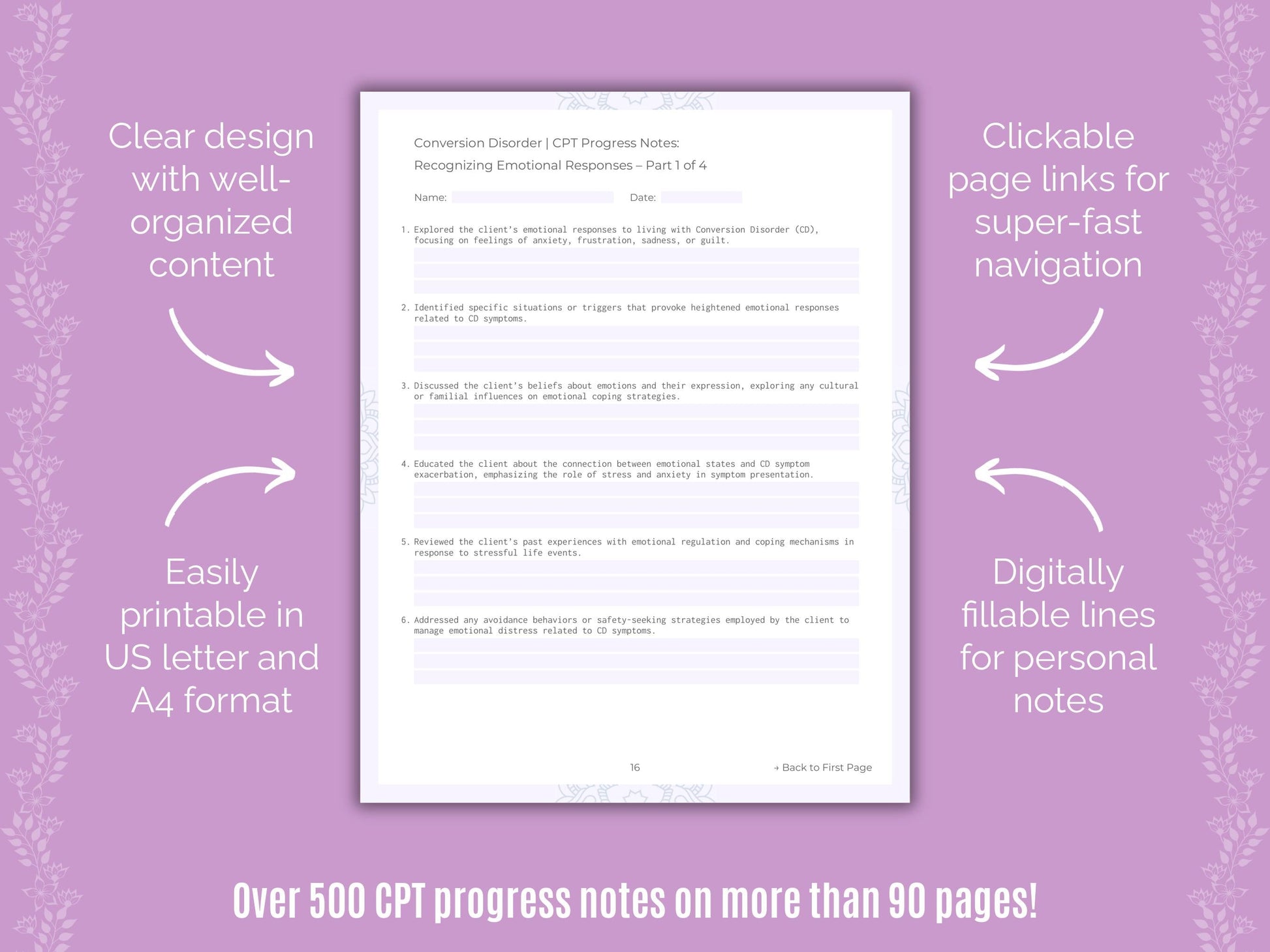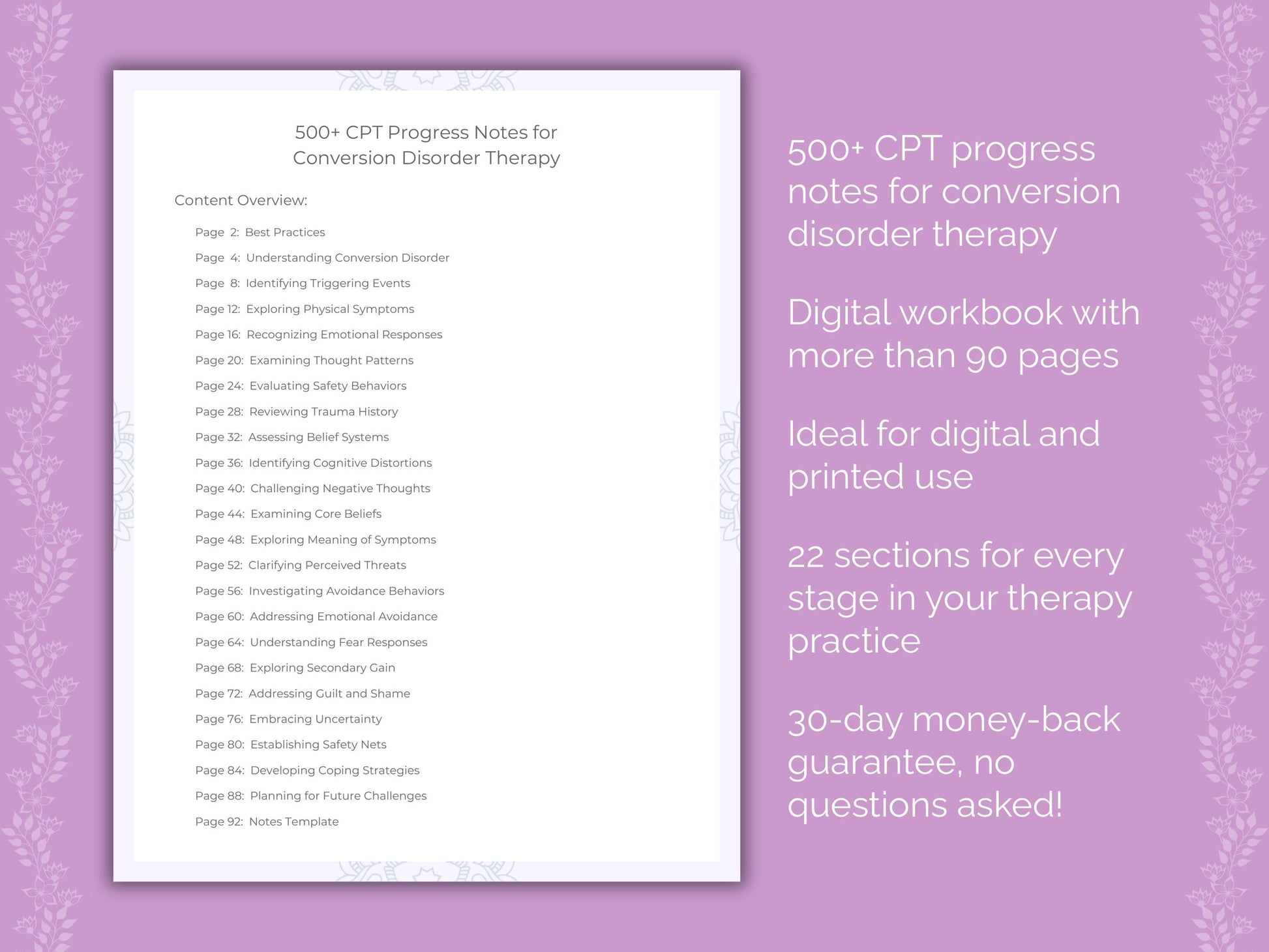 📚 Contains: One PDF workbook with over 500 cognitive processing therapy (CPT) progress notes for conversion disorder therapy in 22 sections, instantly downloadable in US letter and A4 size.