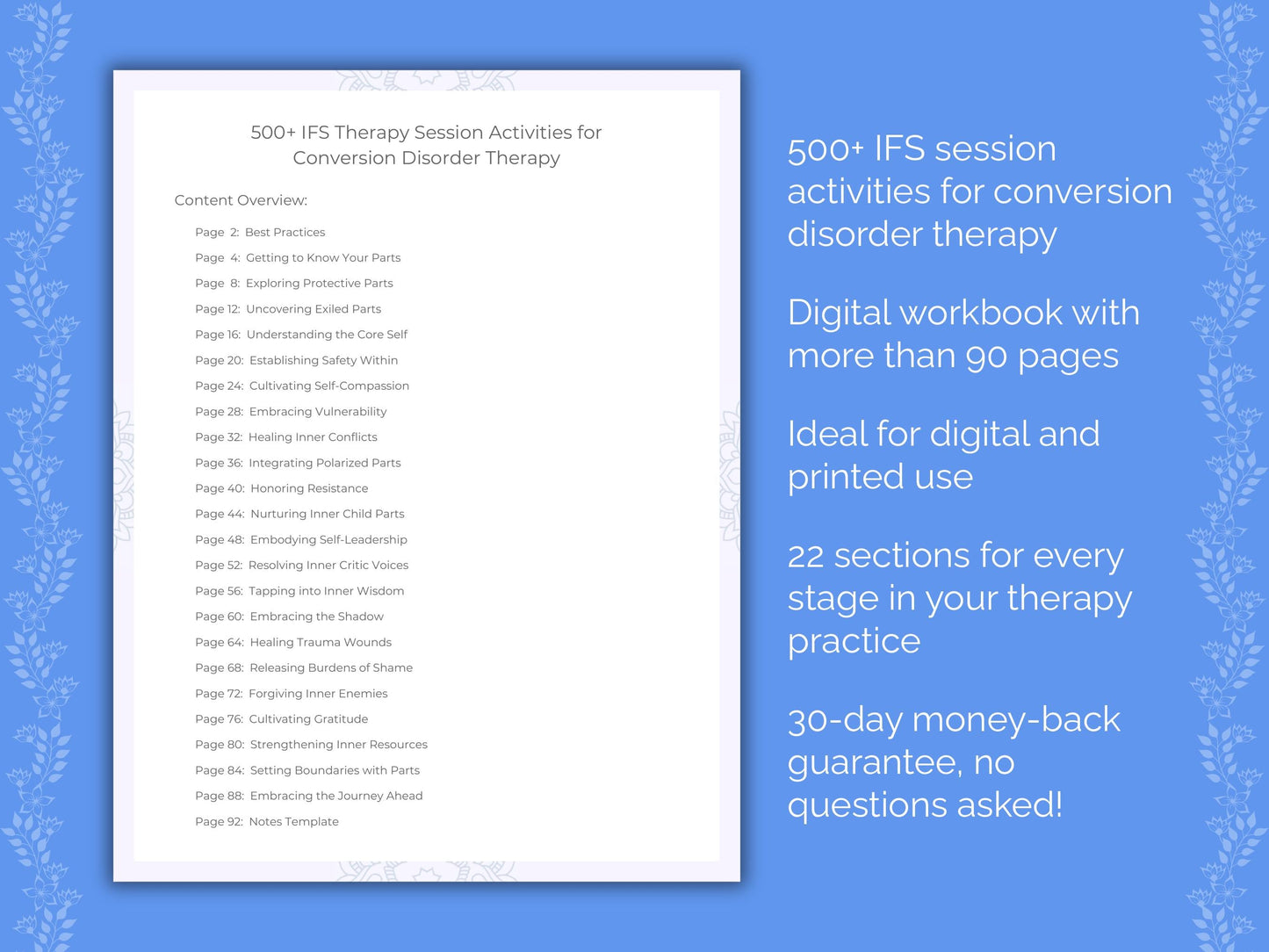 Introducing our Conversion Disorder IFS Session Activities Workbook, your essential toolkit for effective therapy sessions! Boasting a vast collection of over 500 therapy activities in 22 sections, this workbook is meticulously designed to elevate your therapy practice. Unlock your full potential today and take your therapy sessions to the next level!