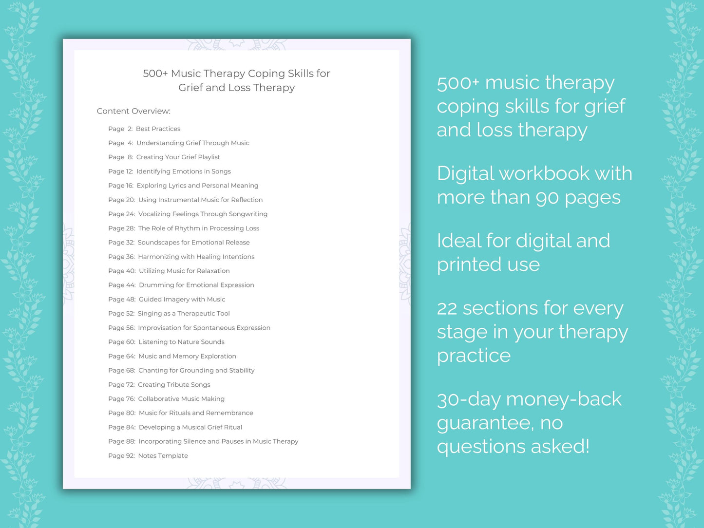 📚 Contains: One PDF workbook with over 500 music therapy coping skills for grief and loss therapy in 22 sections, instantly downloadable in US letter and A4 size.