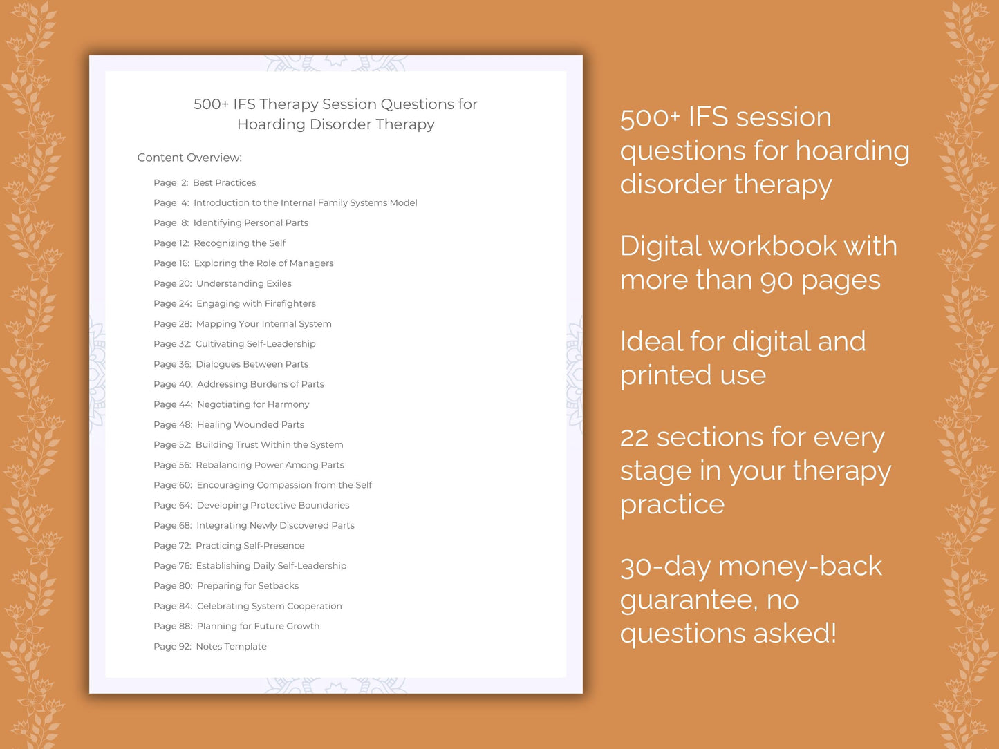 Introducing our Hoarding Disorder IFS Session Questions Workbook, your essential toolkit for effective therapy sessions! Boasting a vast collection of over 500 therapy session questions in 22 sections, this workbook is meticulously designed to elevate your therapy practice. Unlock your full potential today and take your therapy sessions to the next level!