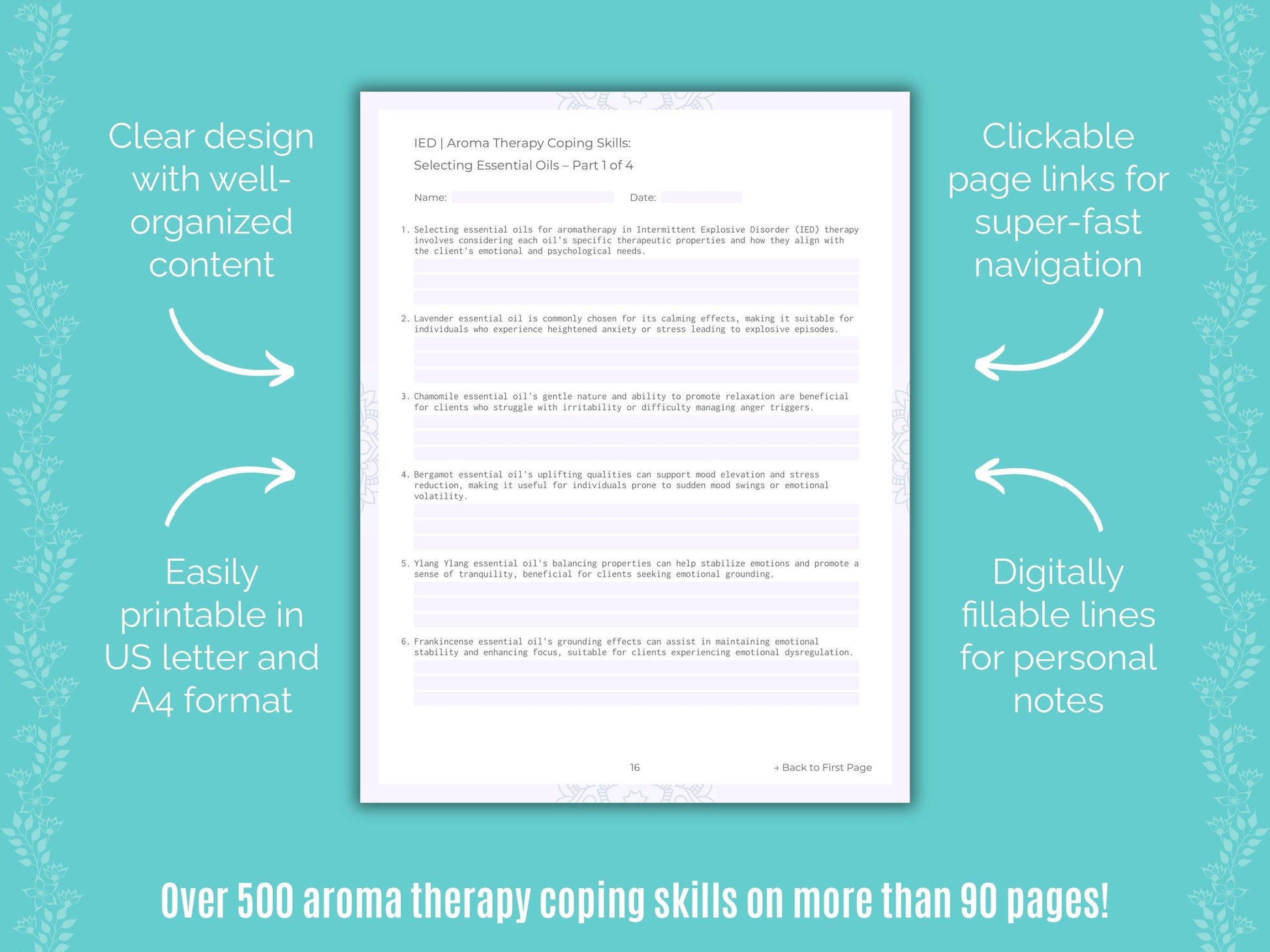 📚 Contains: One PDF workbook with over 500 aroma therapy coping skills for IED therapy in 22 sections, instantly downloadable in US letter and A4 size.