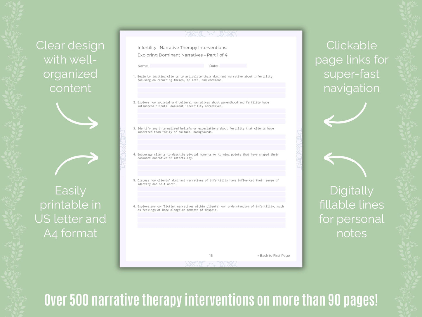 📚 Contains: One PDF workbook with over 500 narrative therapy interventions for infertility therapy in 22 sections, instantly downloadable in US letter and A4 size.
