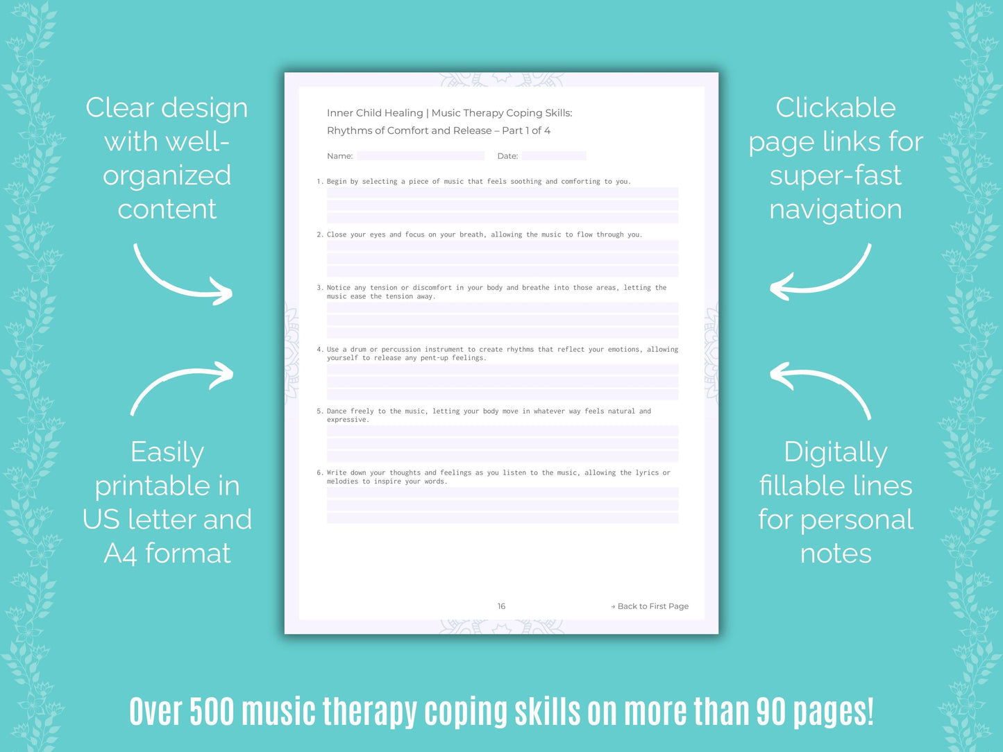 📚 Contains: One PDF workbook with over 500 music therapy coping skills for inner child healing therapy in 22 sections, instantly downloadable in US letter and A4 size.