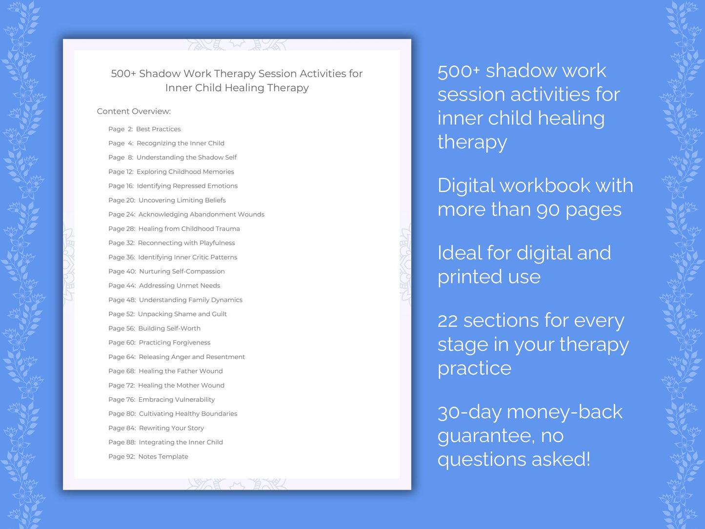 📚 Contains: One PDF workbook with over 500 shadow work therapy session activities for inner child healing therapy in 22 sections, instantly downloadable in US letter and A4 size.