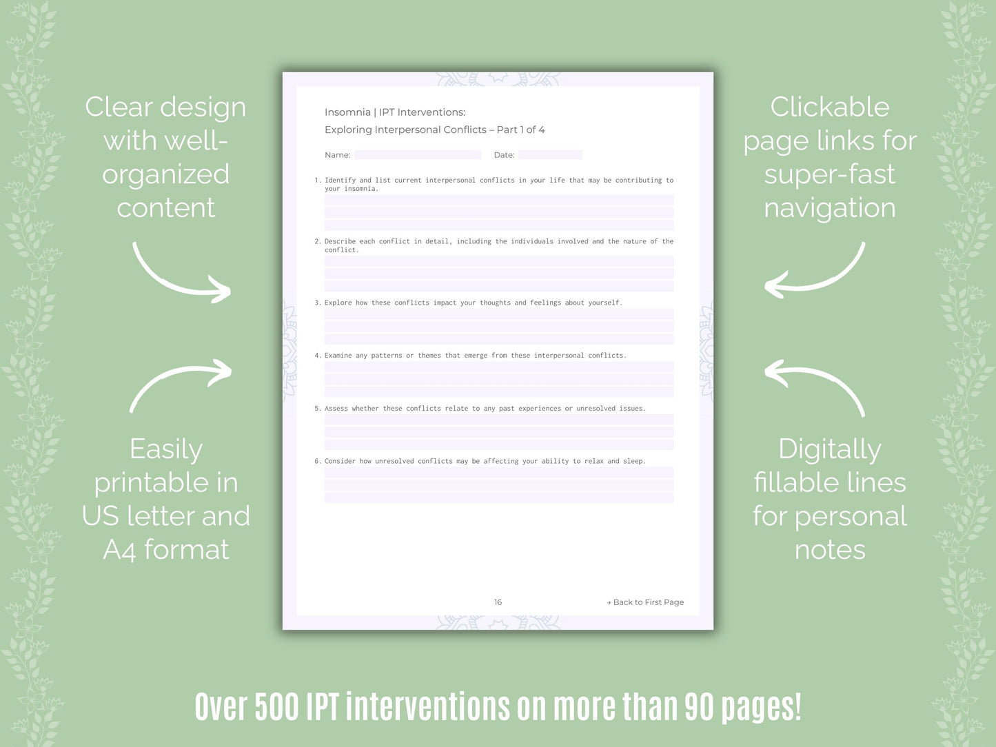 📚 Contains: One PDF workbook with over 500 interpersonal therapy (IPT) interventions for insomnia therapy in 22 sections, instantly downloadable in US letter and A4 size.