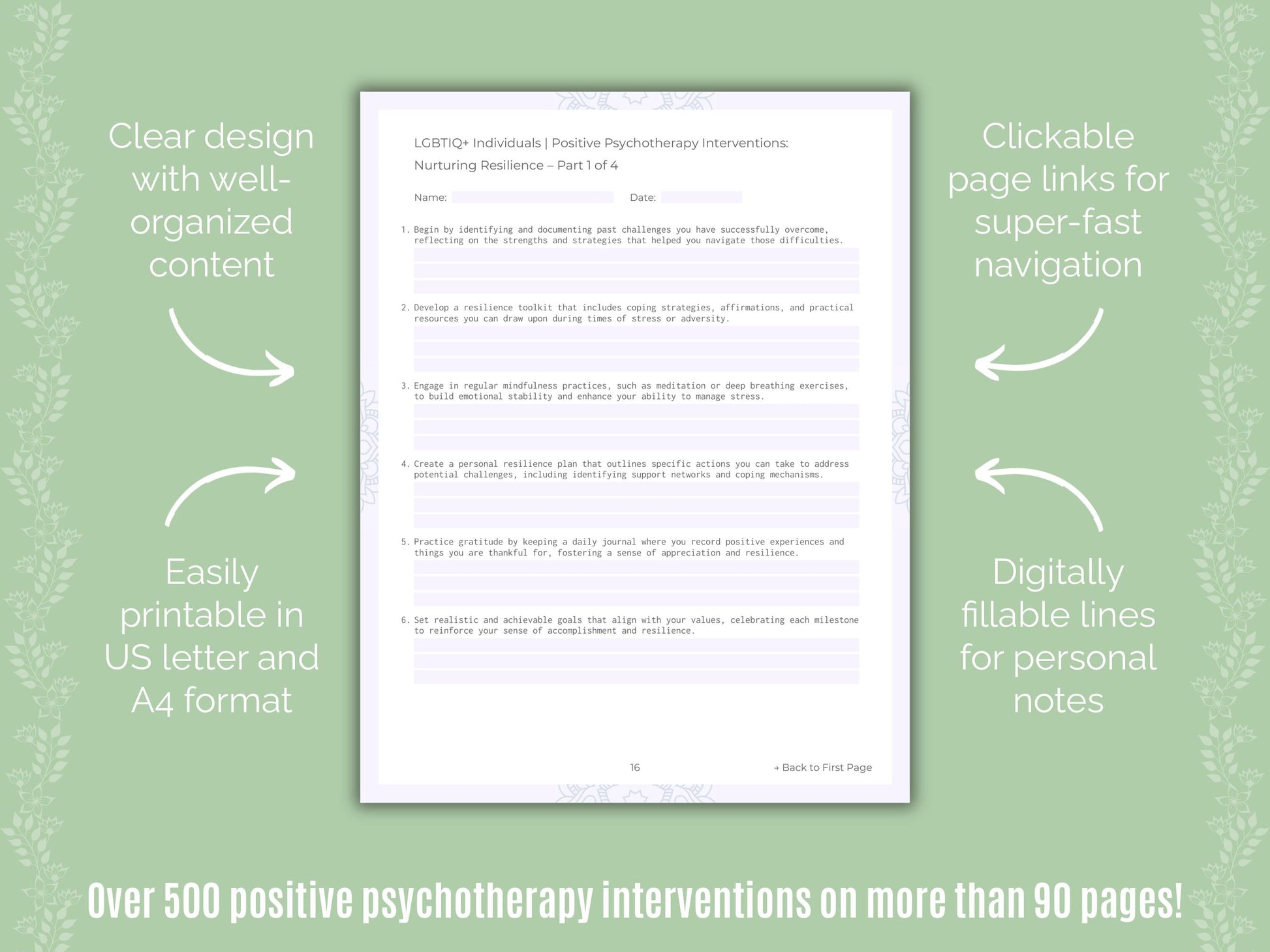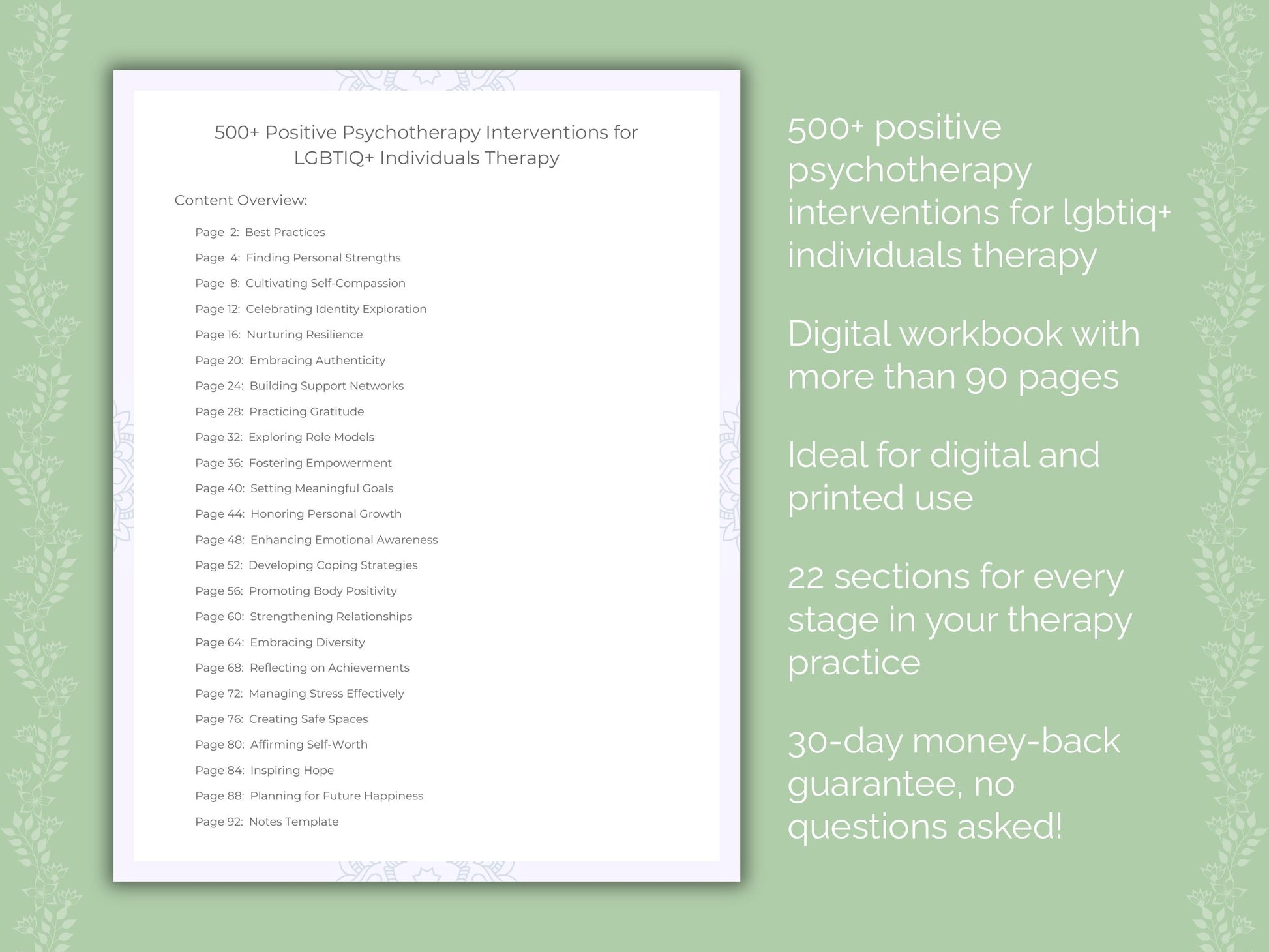 📚 Contains: One PDF workbook with over 500 positive psychotherapy interventions for lgbtiq+ individuals therapy in 22 sections, instantly downloadable in US letter and A4 size.