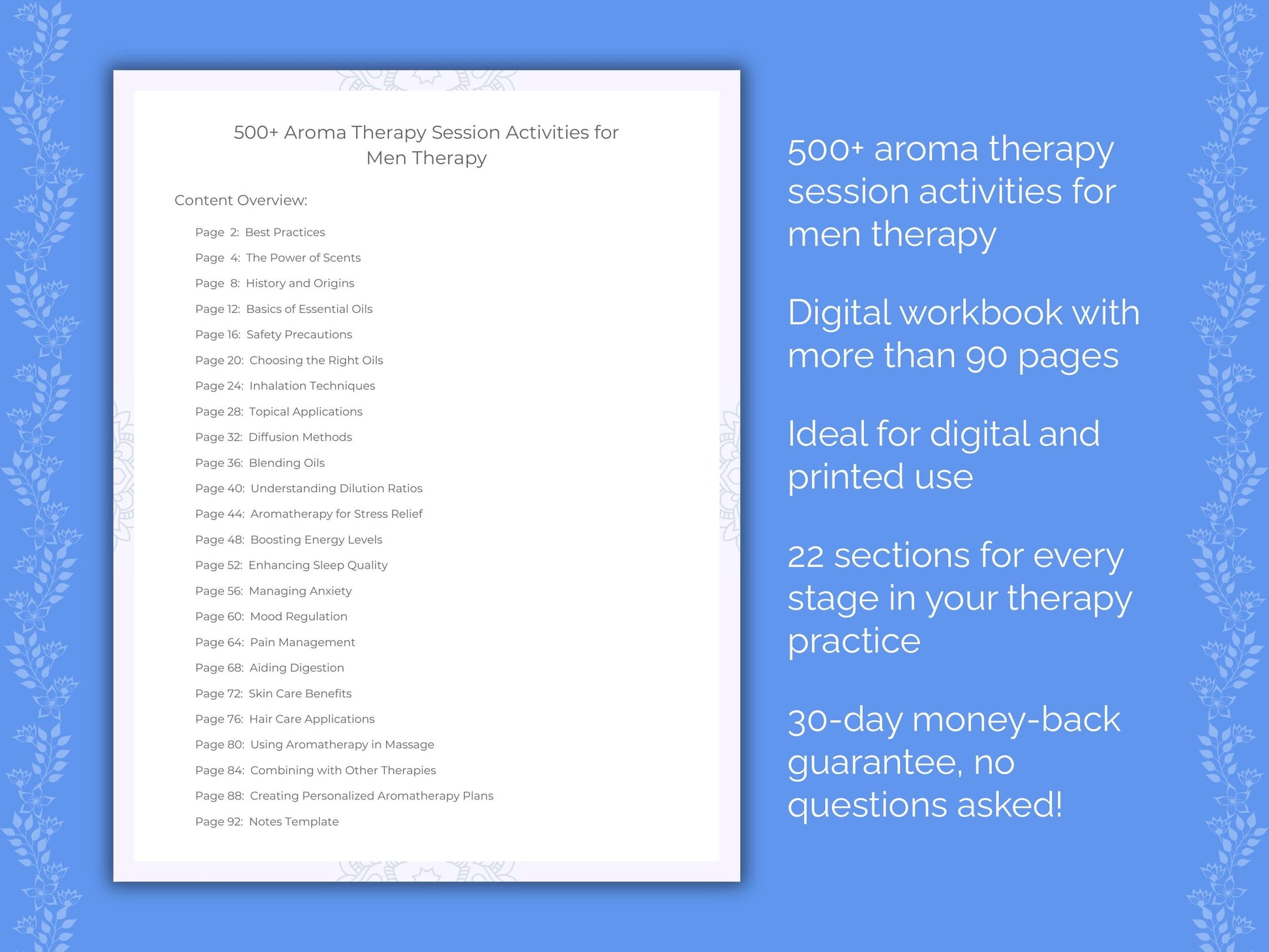 📚 Contains: One PDF workbook with over 500 aroma therapy session activities for men therapy in 22 sections, instantly downloadable in US letter and A4 size.