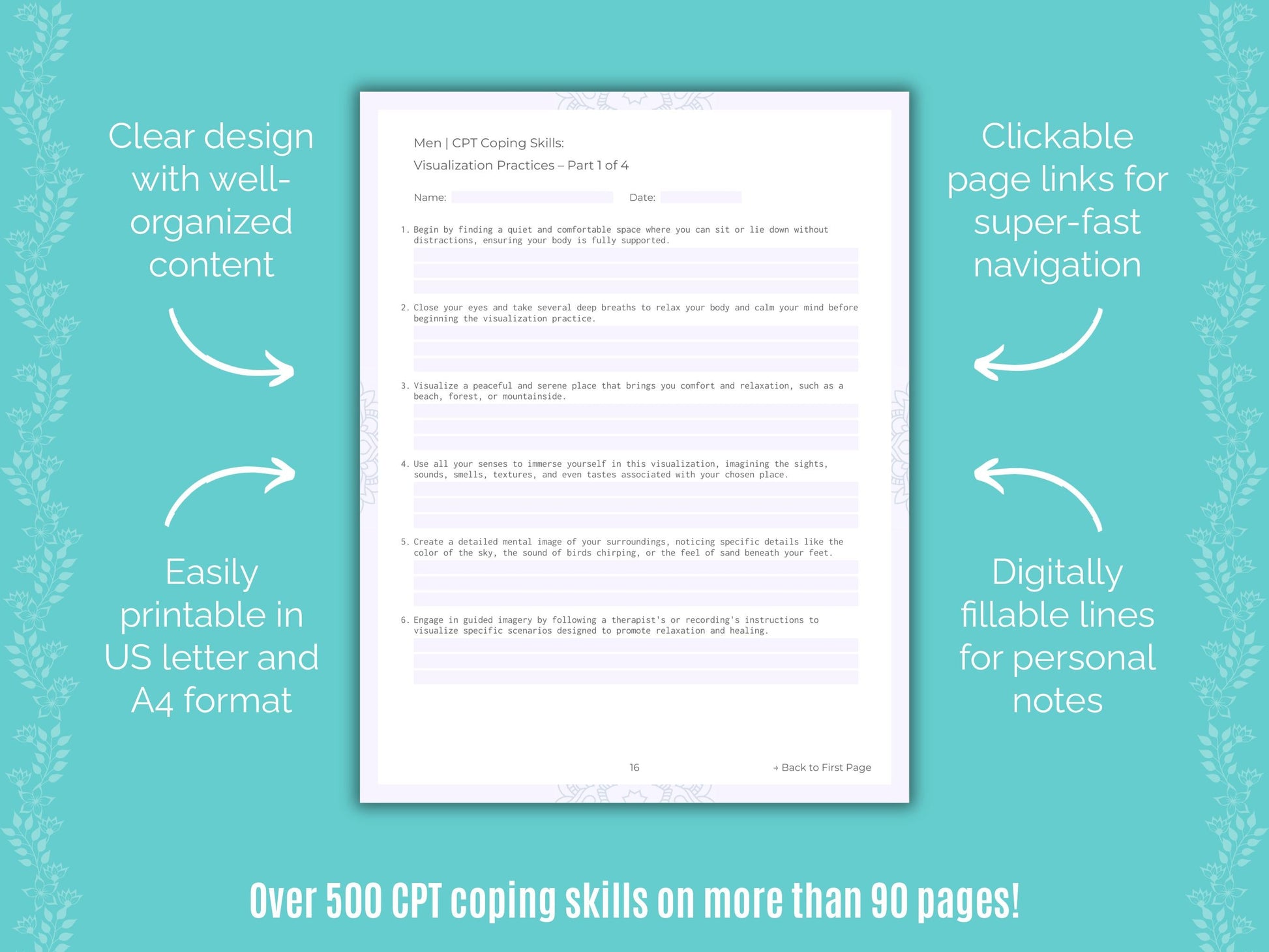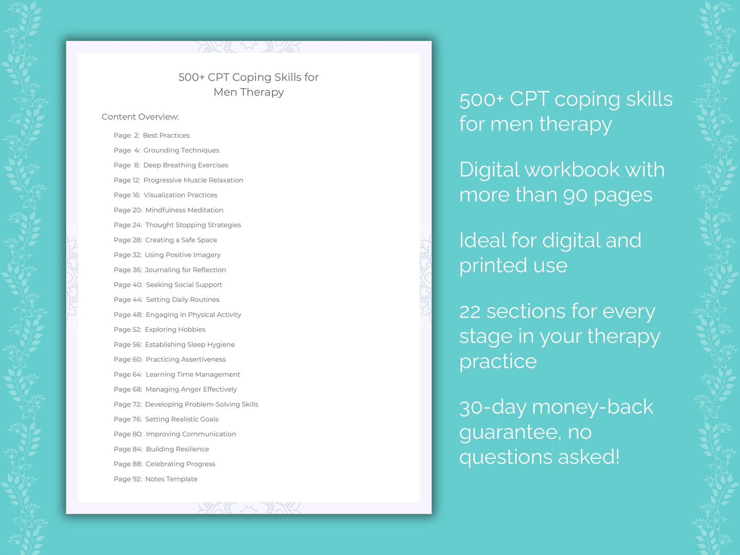 📚 Contains: One PDF workbook with over 500 cognitive processing therapy (CPT) coping skills for men therapy in 22 sections, instantly downloadable in US letter and A4 size.