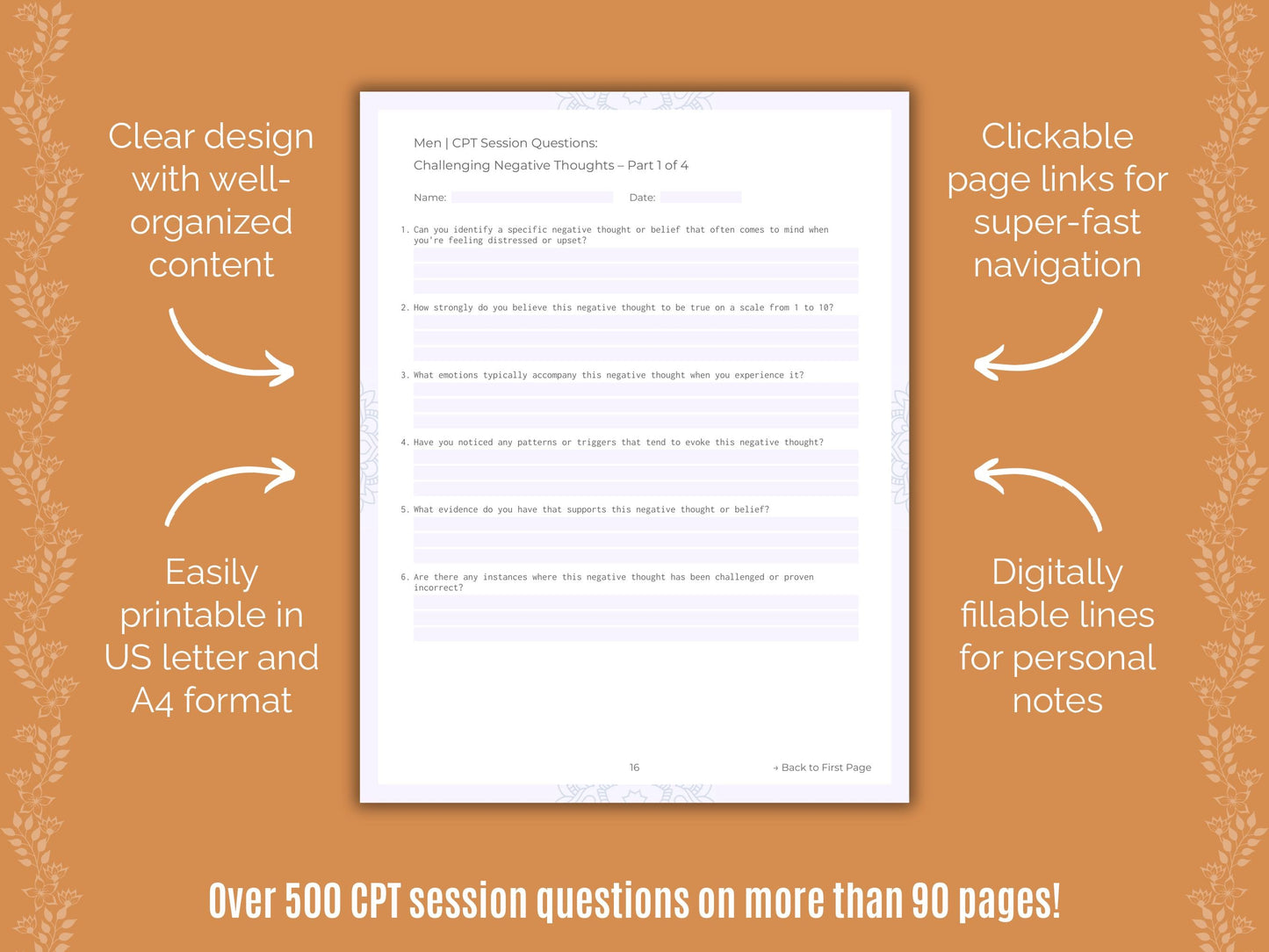 📚 Contains: One PDF workbook with over 500 cognitive processing therapy (CPT) session questions for men therapy in 22 sections, instantly downloadable in US letter and A4 size.