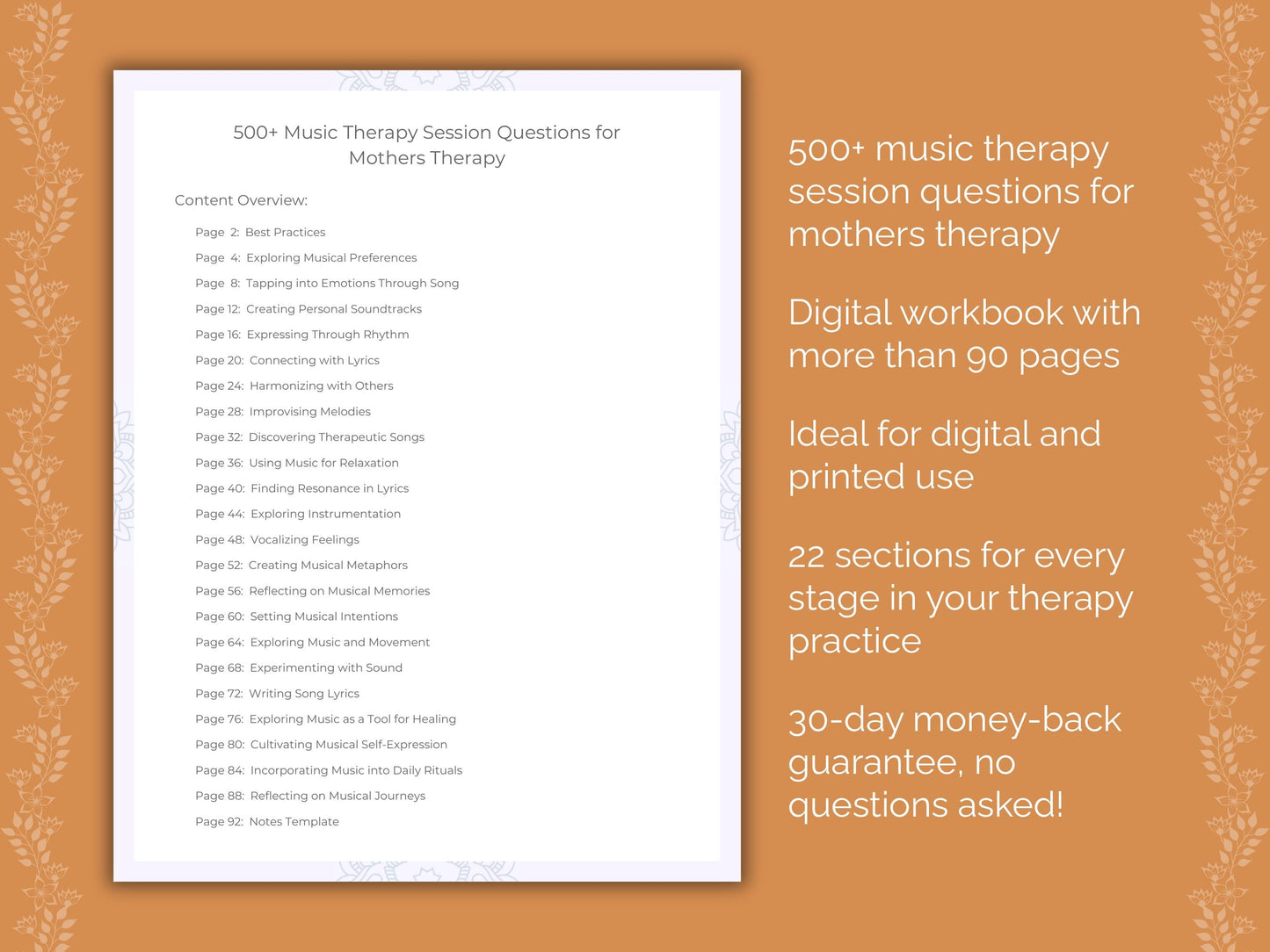 📚 Contains: One PDF workbook with over 500 music therapy session questions for mothers therapy in 22 sections, instantly downloadable in US letter and A4 size.