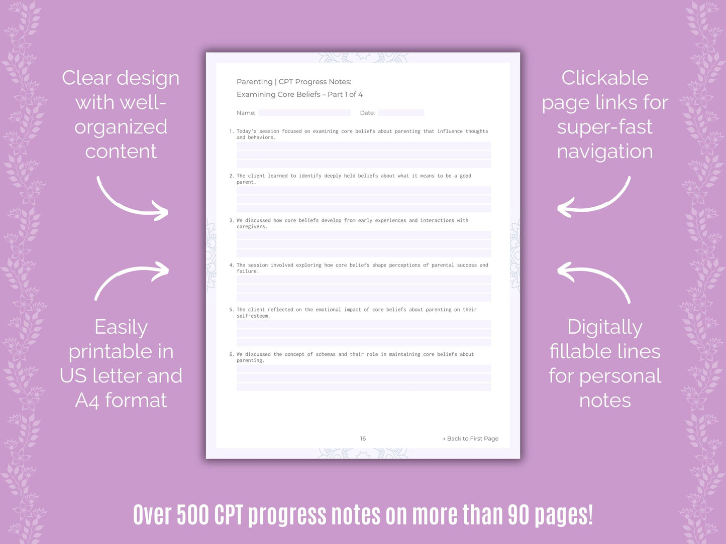 📚 Contains: One PDF workbook with over 500 cognitive processing therapy (CPT) progress notes for parenting therapy in 22 sections, instantly downloadable in US letter and A4 size.