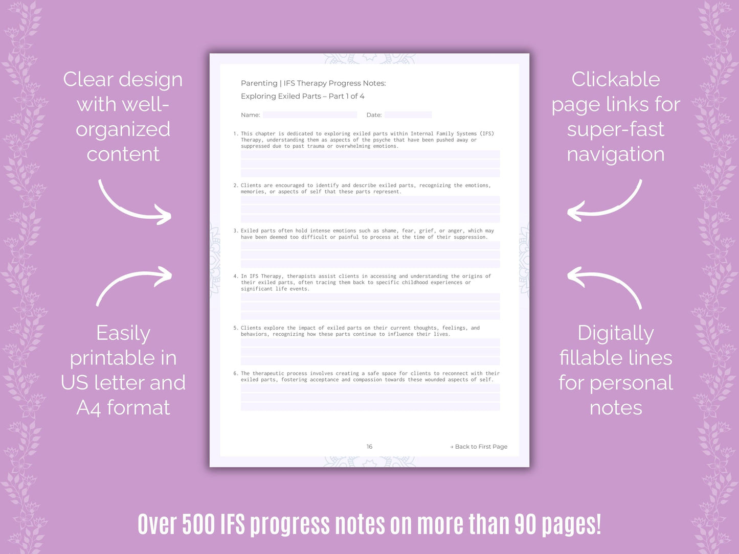 📚 Contains: One PDF workbook with over 500 internal family systems (IFS) therapy progress notes for parenting therapy in 22 sections, instantly downloadable in US letter and A4 size.