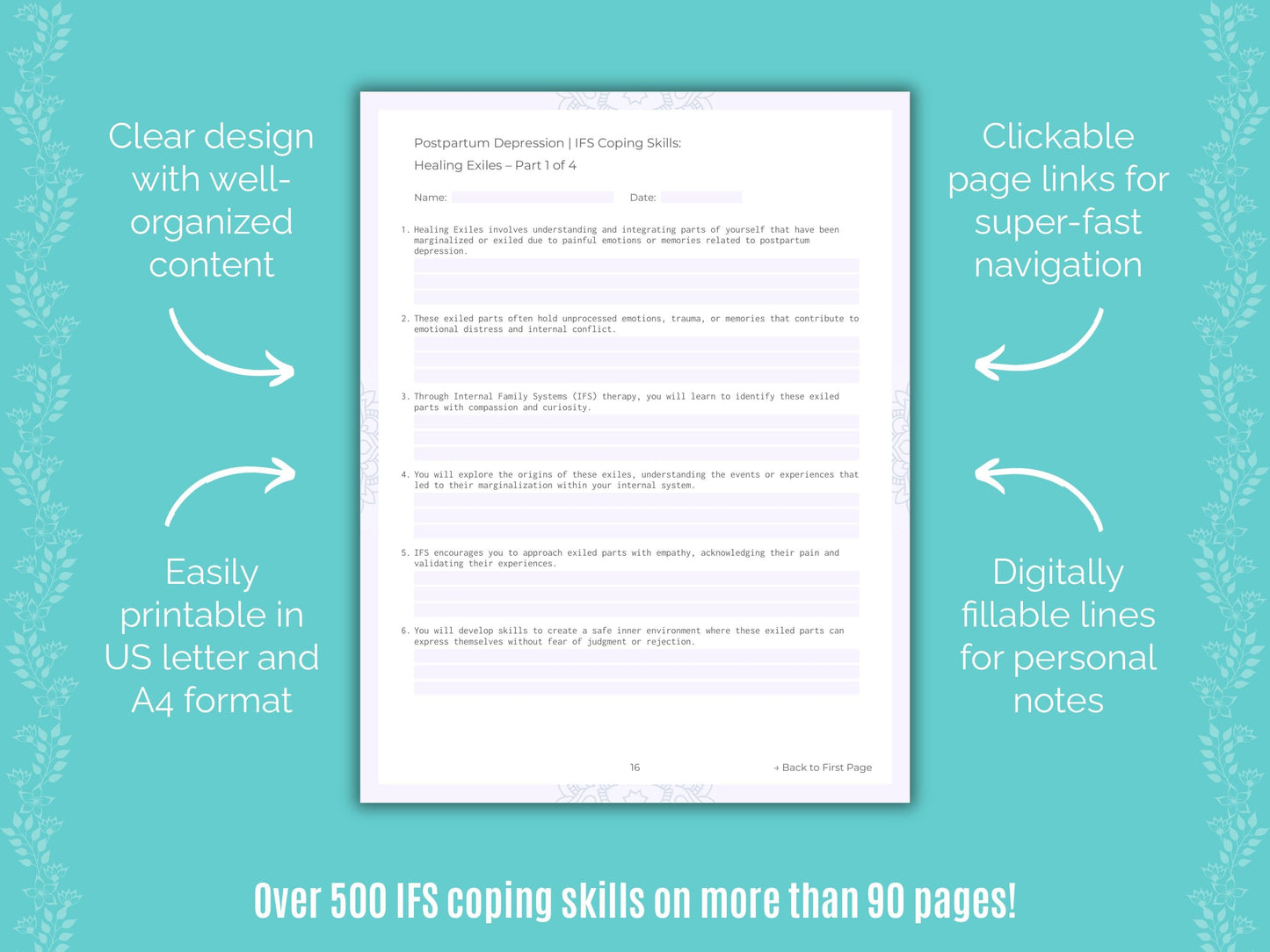 📚 Contains: One PDF workbook with over 500 internal family systems (IFS) coping skills for postpartum depression therapy in 22 sections, instantly downloadable in US letter and A4 size.