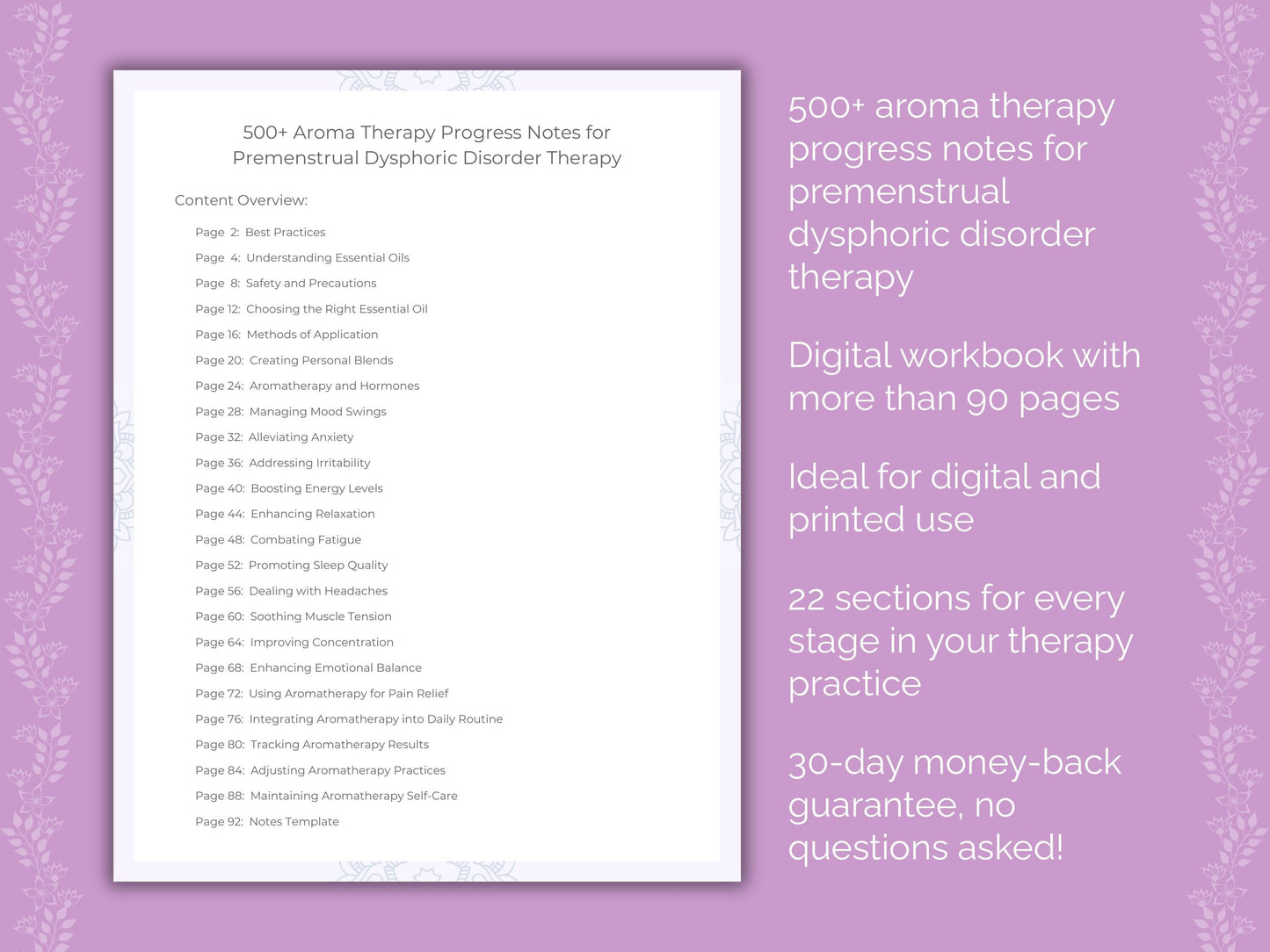 📚 Contains: One PDF workbook with over 500 aroma therapy progress notes for premenstrual dysphoric disorder therapy in 22 sections, instantly downloadable in US letter and A4 size.