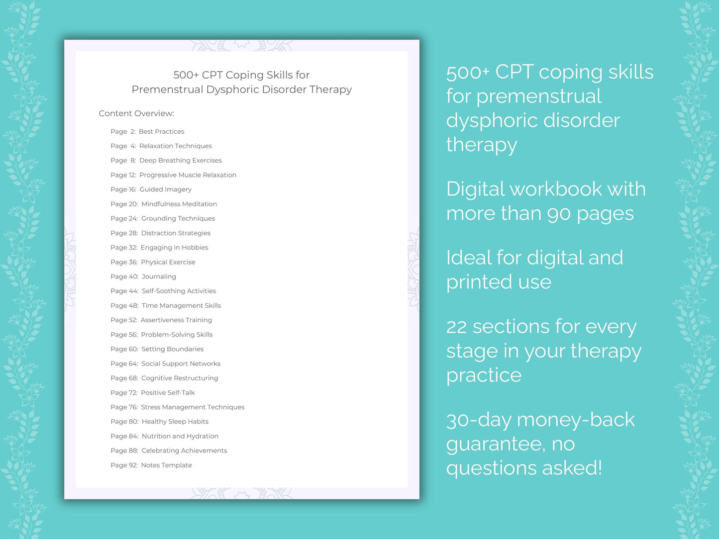 Our workbook covers over 500 unique CPT coping skills for premenstrual dysphoric disorder therapy in 22 sections, including: