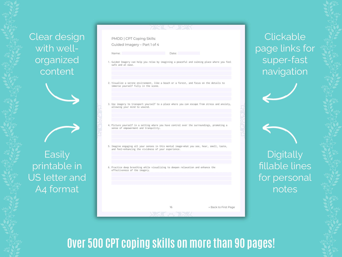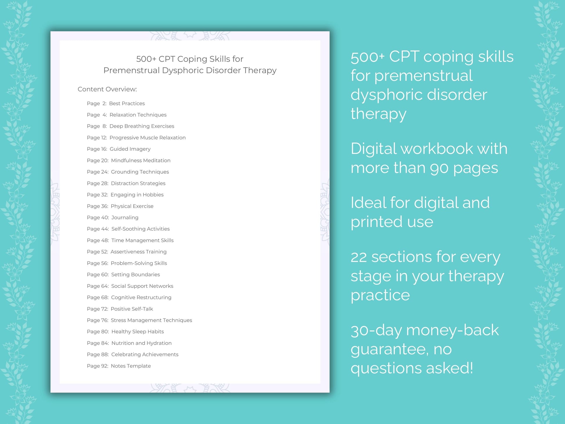 📚 Contains: One PDF workbook with over 500 cognitive processing therapy (CPT) coping skills for premenstrual dysphoric disorder therapy in 22 sections, instantly downloadable in US letter and A4 size.