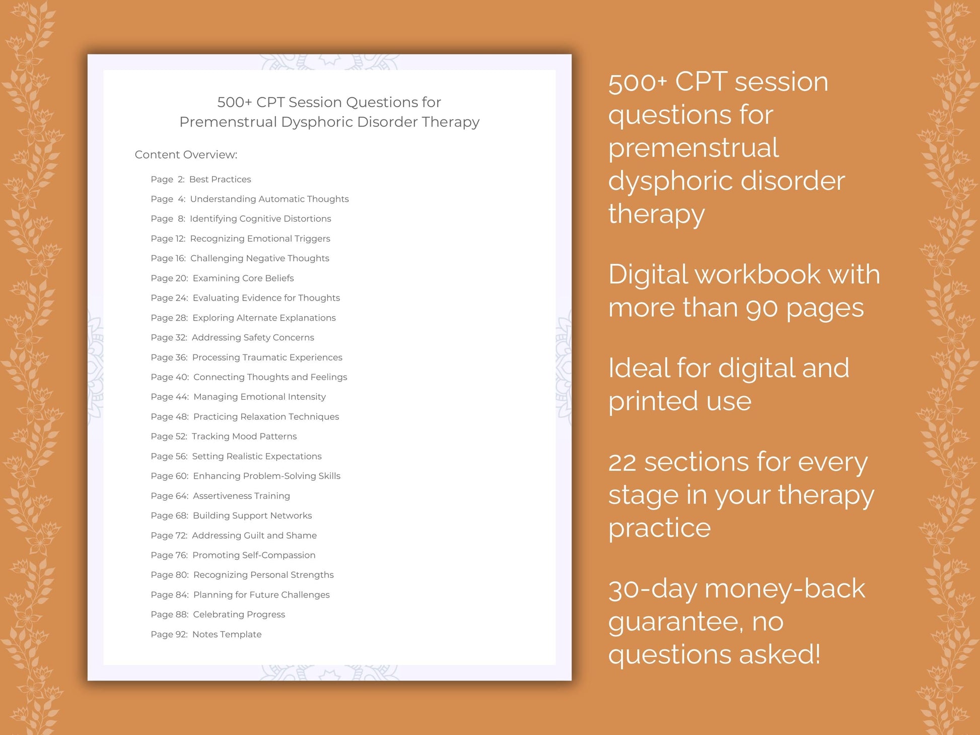 Our workbook covers over 500 unique CPT session questions for premenstrual dysphoric disorder therapy in 22 sections, including: