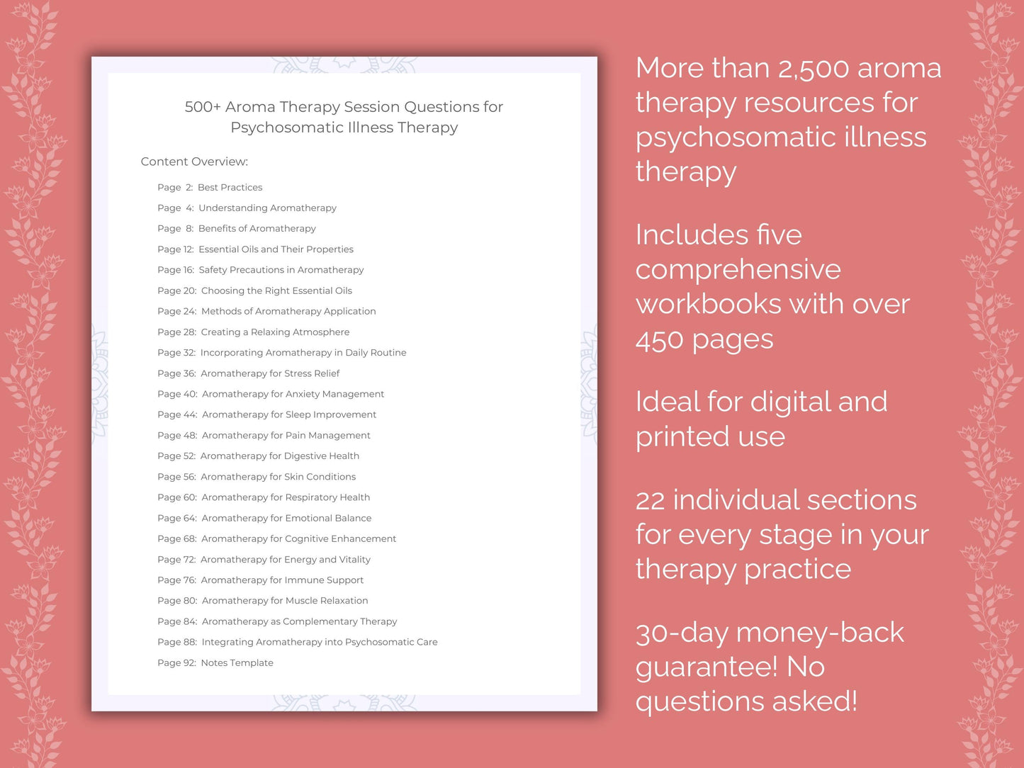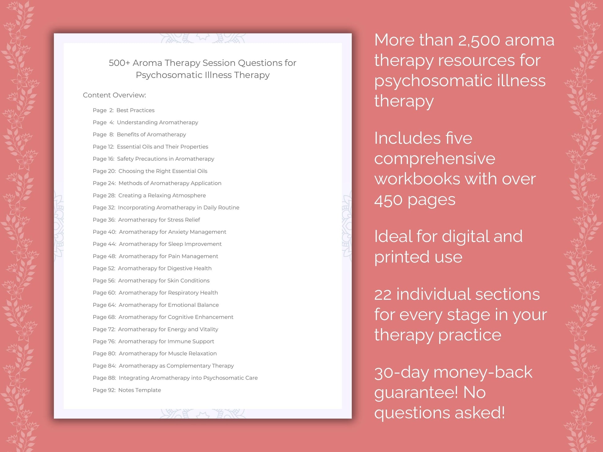 This workbooks bundle for psychosomatic illness therapy covers over 2,500 unique aroma therapy resources, including: