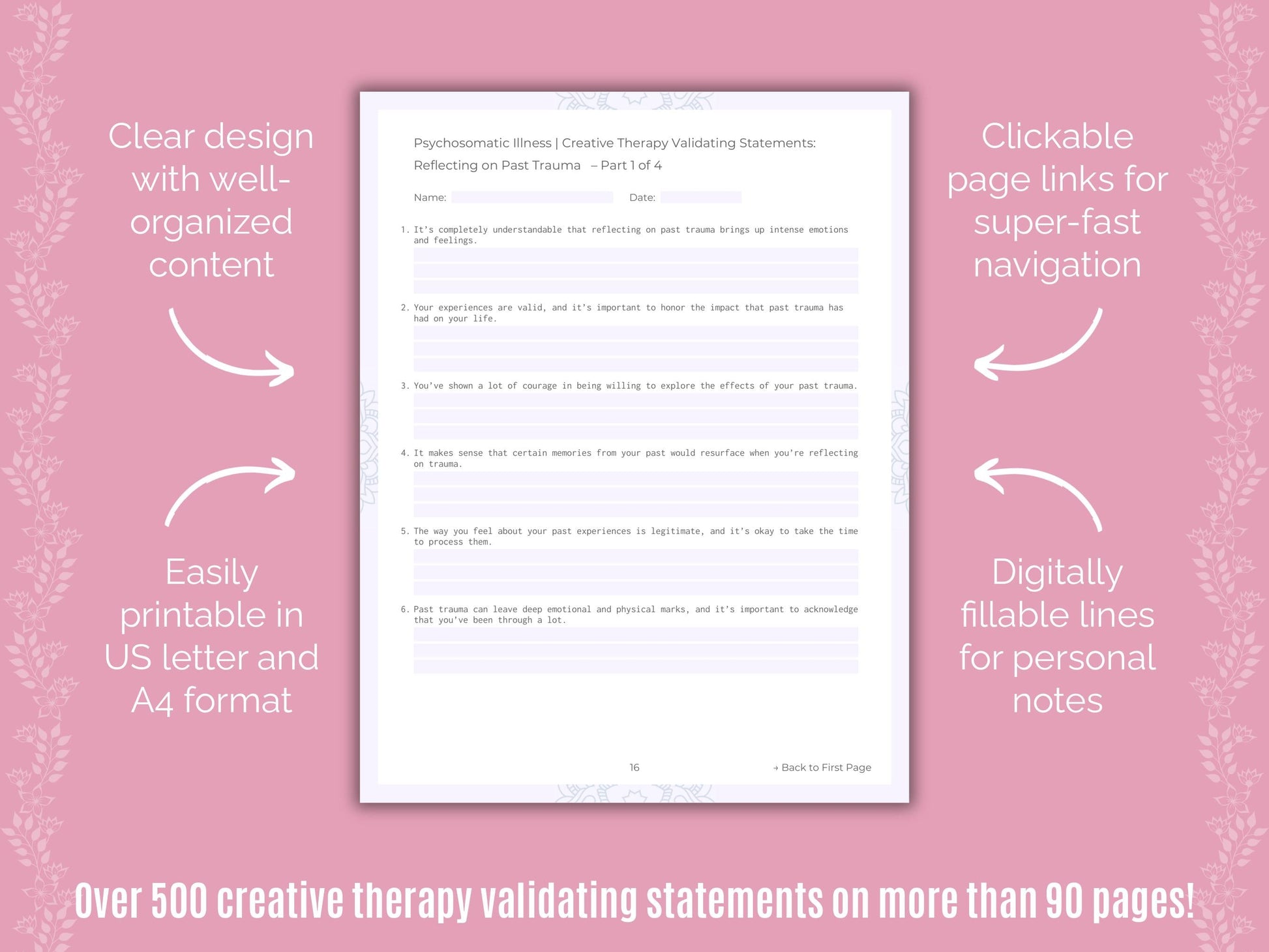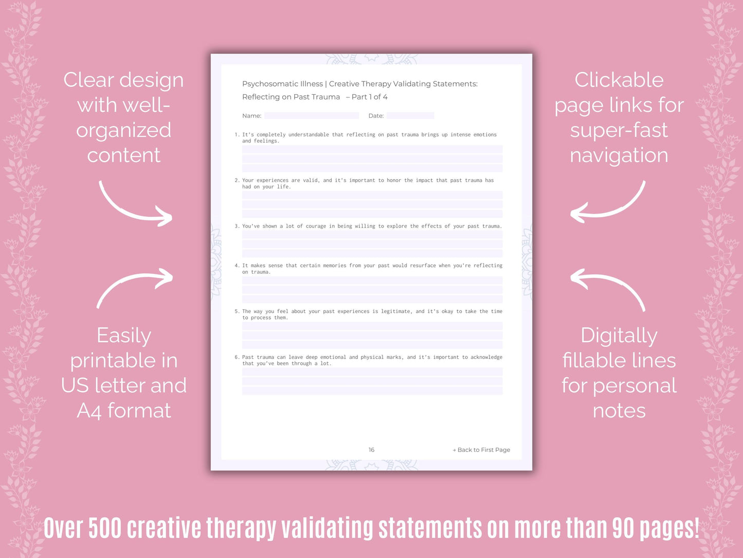 📚 Contains: One PDF workbook with over 500 creative therapy validating statements for psychosomatic illness therapy in 22 sections, instantly downloadable in US letter and A4 size.