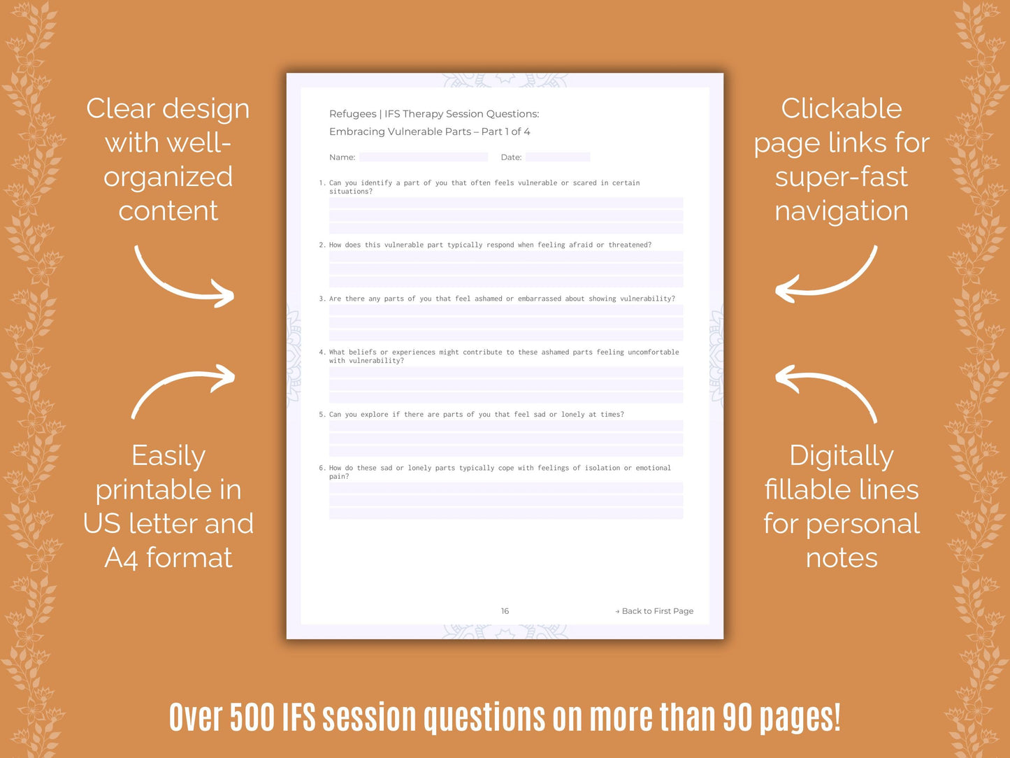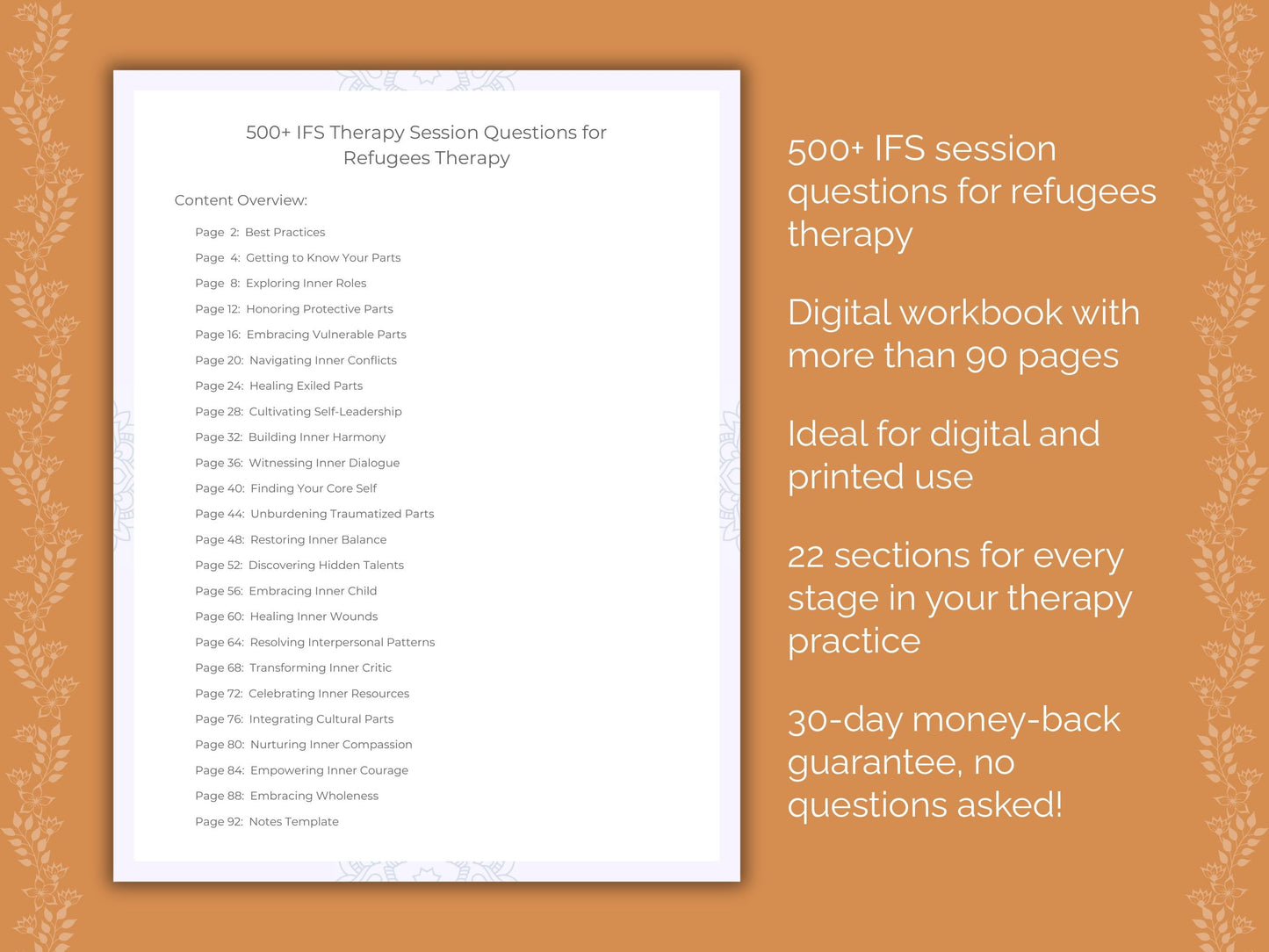📚 Contains: One PDF workbook with over 500 internal family systems (IFS) therapy session questions for refugees therapy in 22 sections, instantly downloadable in US letter and A4 size.