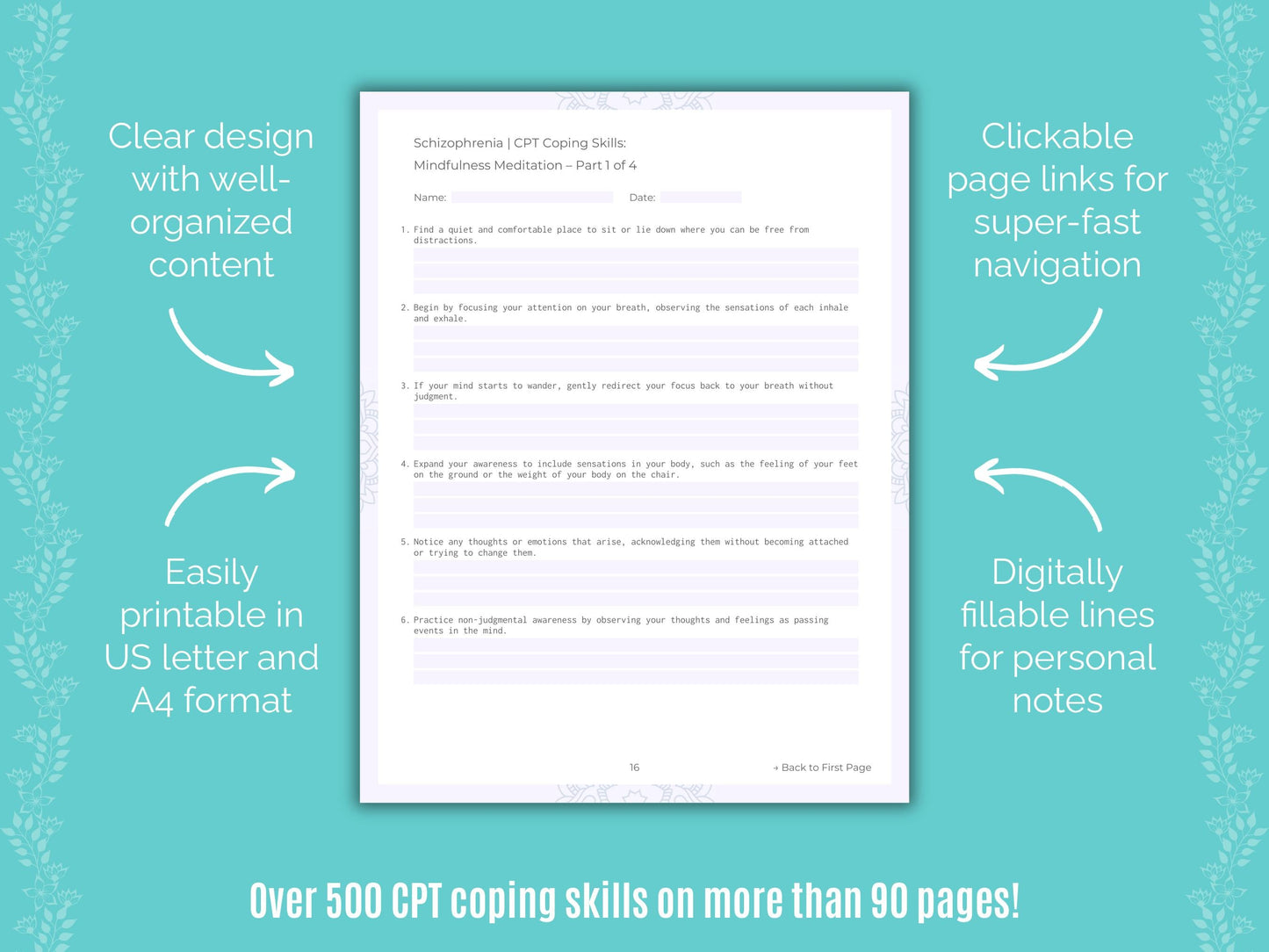 📚 Contains: One PDF workbook with over 500 cognitive processing therapy (CPT) coping skills for schizophrenia therapy in 22 sections, instantly downloadable in US letter and A4 size.