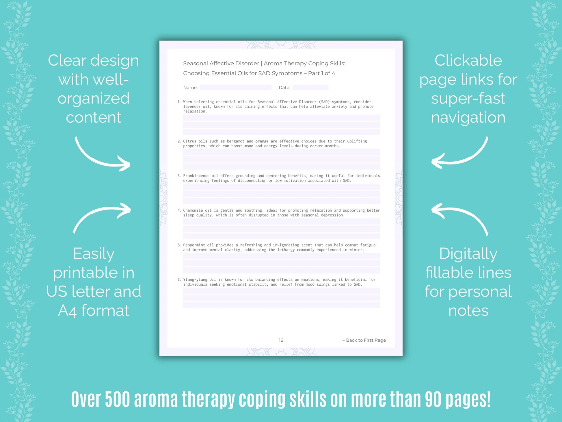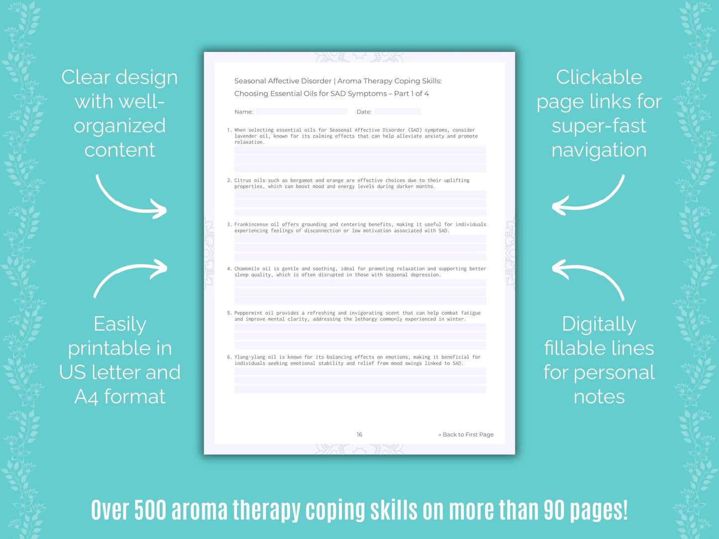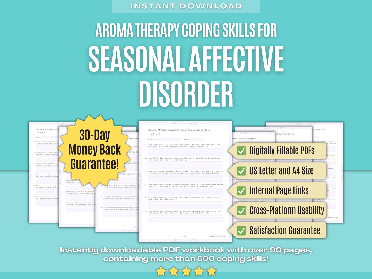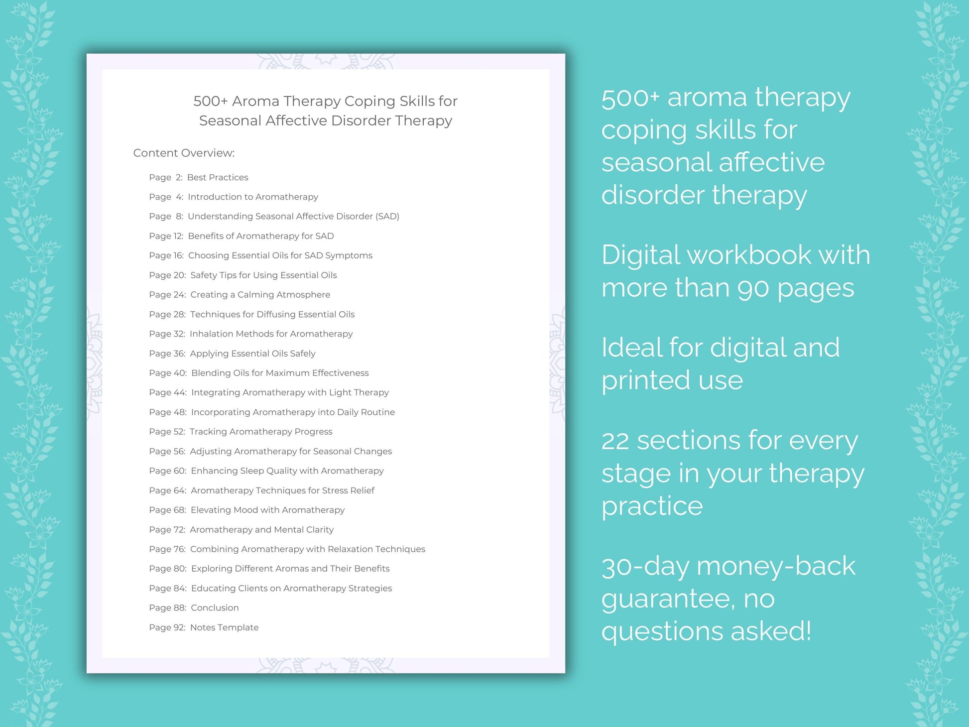 📚 Contains: One PDF workbook with over 500 aroma therapy coping skills for seasonal affective disorder therapy in 22 sections, instantly downloadable in US letter and A4 size.