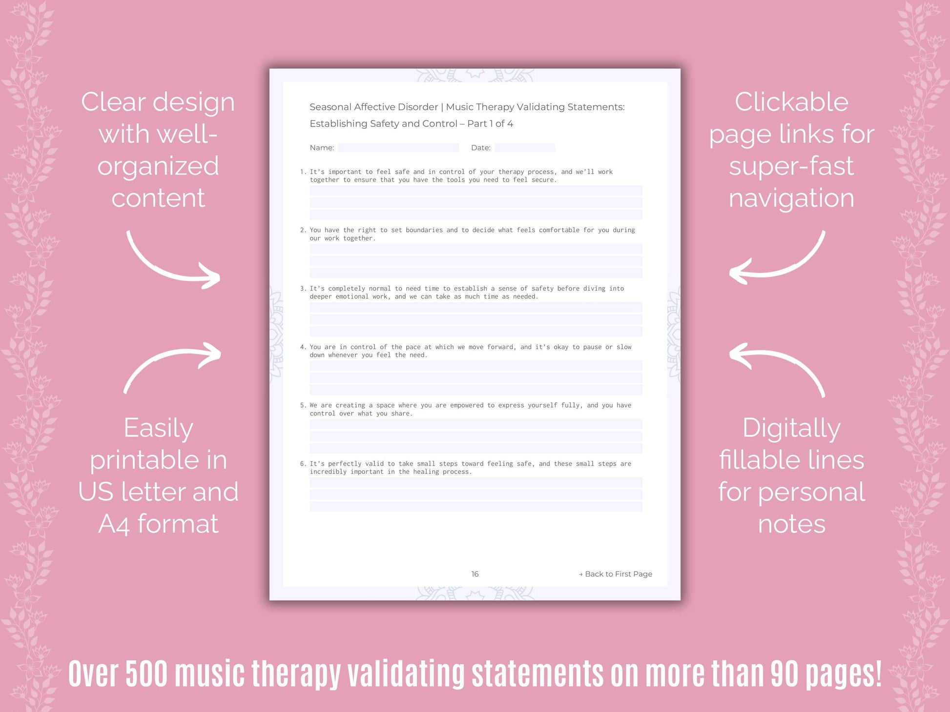 📚 Contains: One PDF workbook with over 500 music therapy validating statements for seasonal affective disorder therapy in 22 sections, instantly downloadable in US letter and A4 size.
