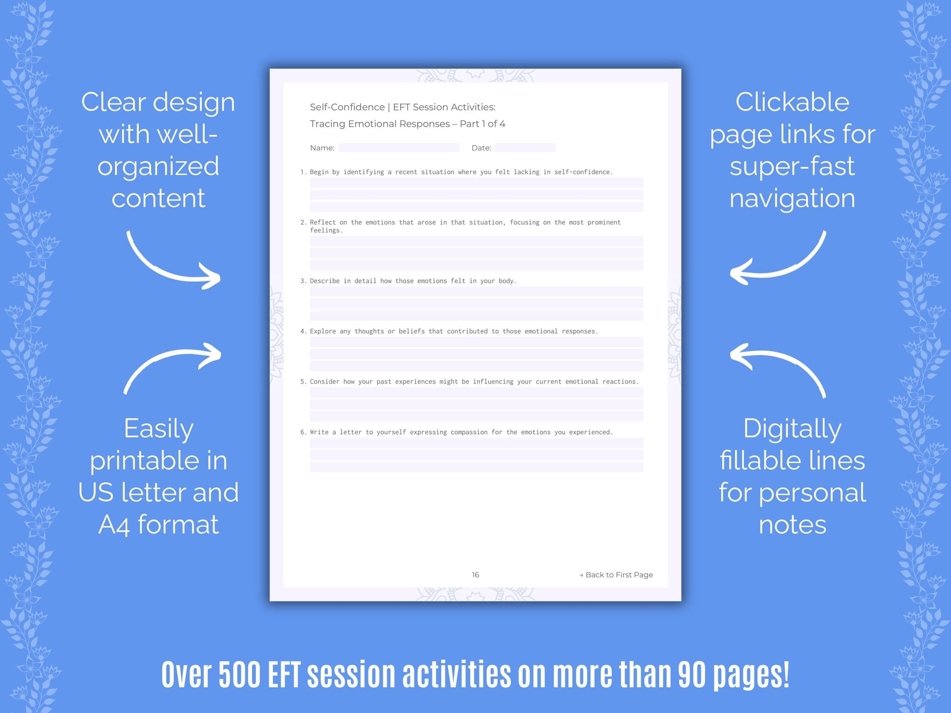 📚 Contains: One PDF workbook with over 500 emotionally focused therapy (EFT) session activities for self-confidence therapy in 22 sections, instantly downloadable in US letter and A4 size.