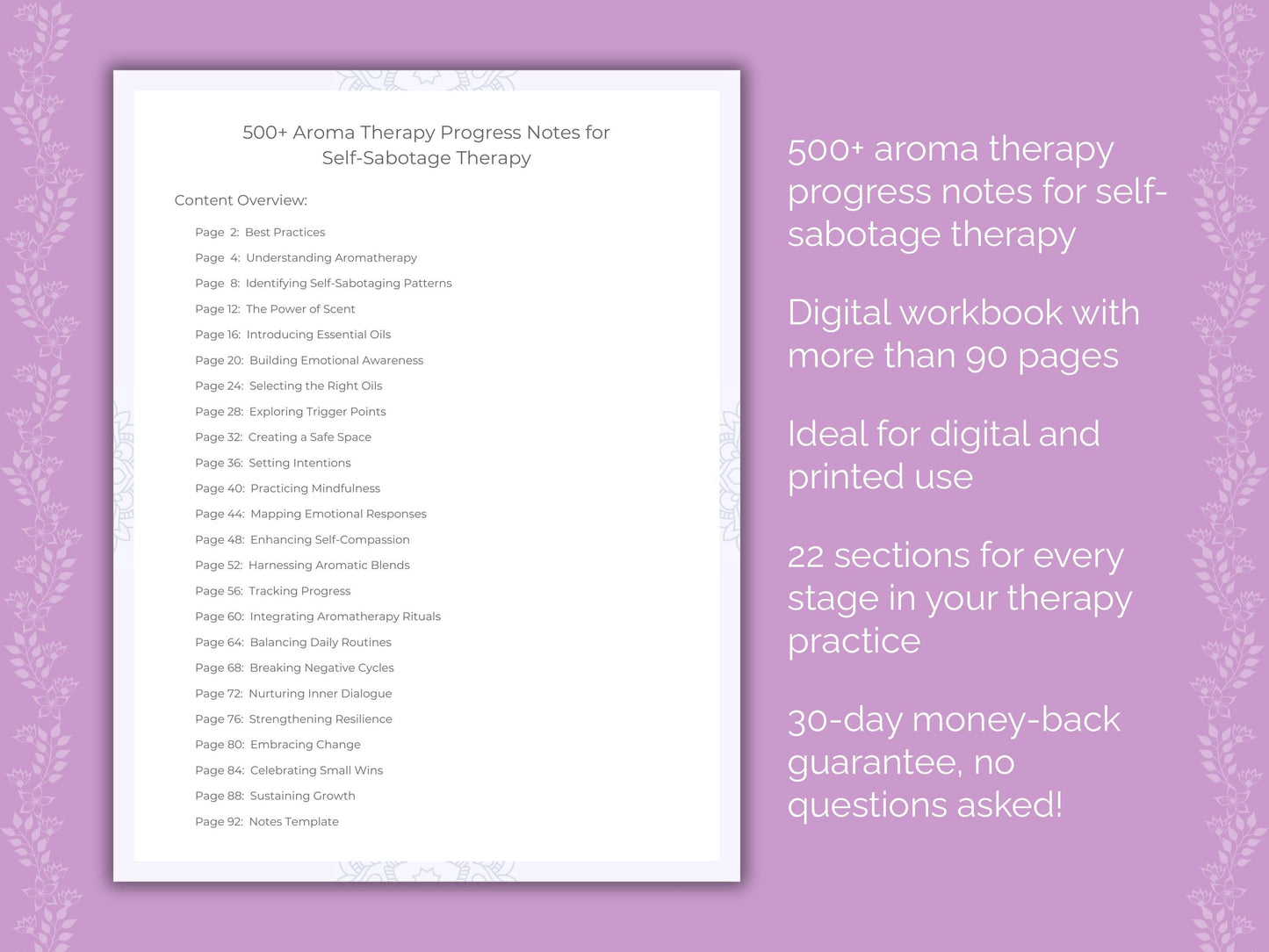 📚 Contains: One PDF workbook with over 500 aroma therapy progress notes for self-sabotage therapy in 22 sections, instantly downloadable in US letter and A4 size.