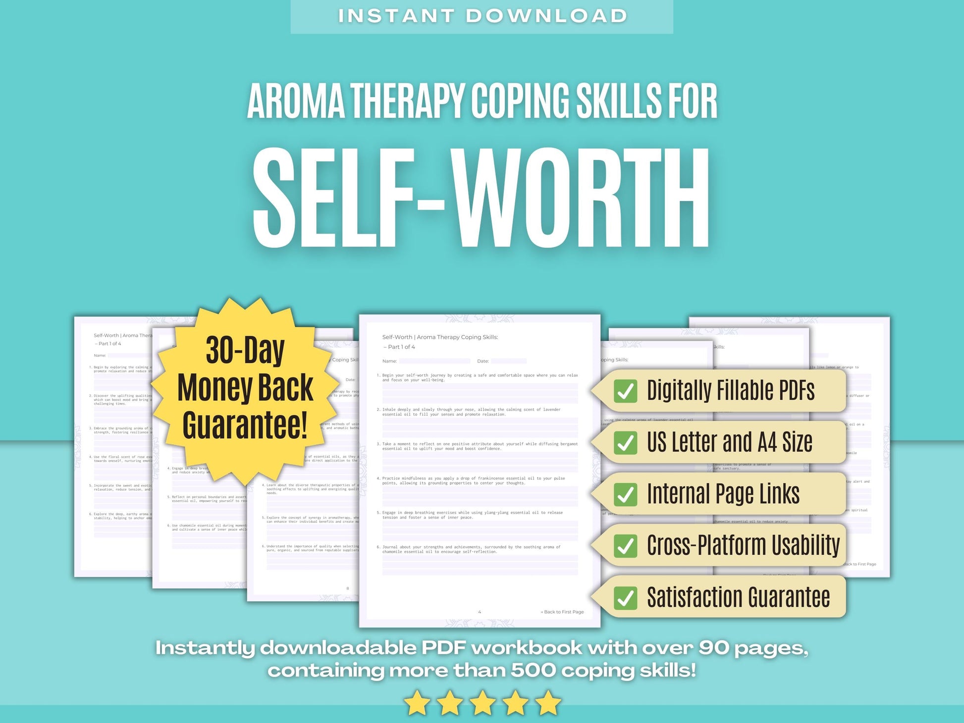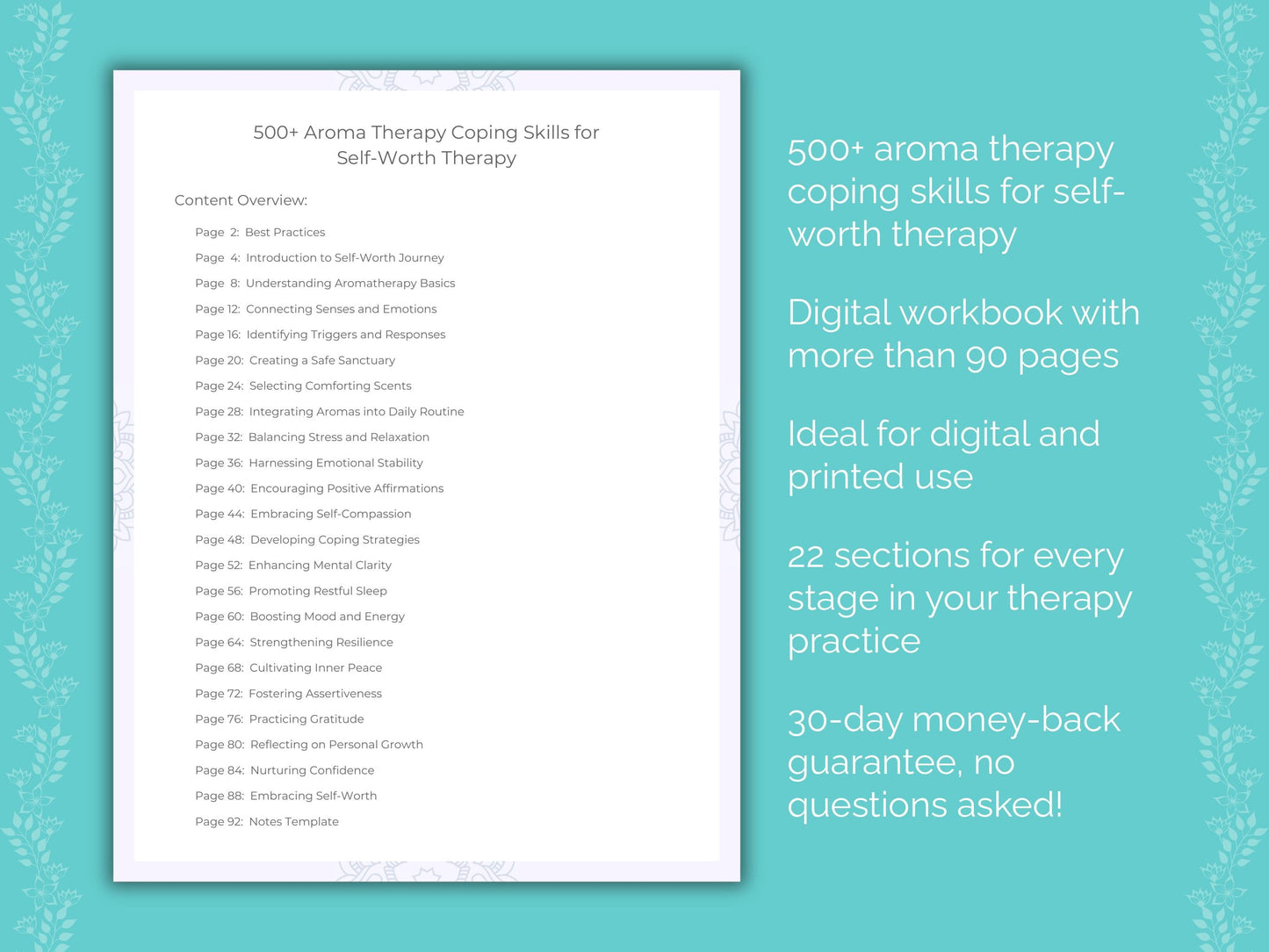 📚 Contains: One PDF workbook with over 500 aroma therapy coping skills for self-worth therapy in 22 sections, instantly downloadable in US letter and A4 size.