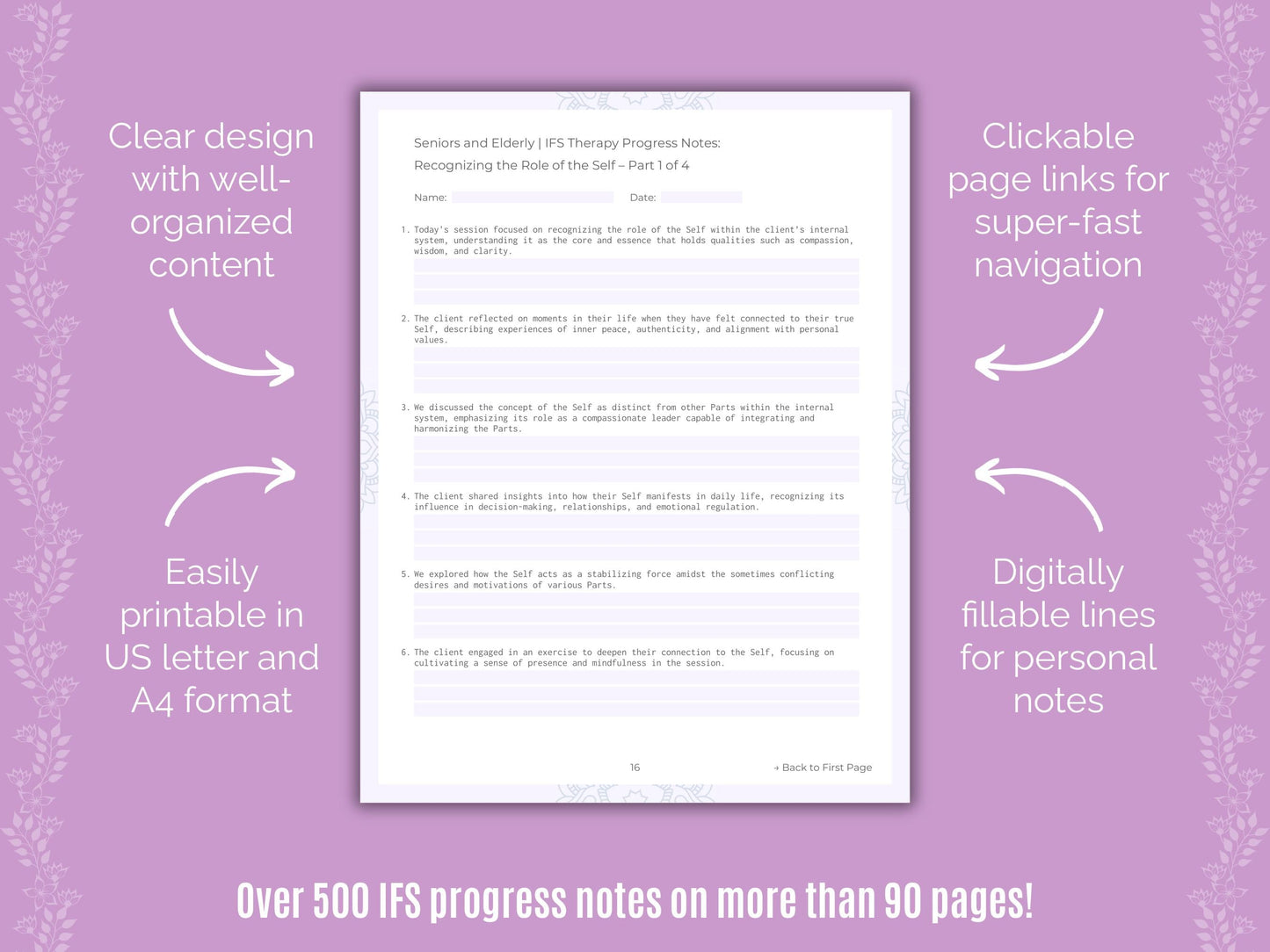 📚 Contains: One PDF workbook with over 500 internal family systems (IFS) therapy progress notes for seniors and elderly therapy in 22 sections, instantly downloadable in US letter and A4 size.