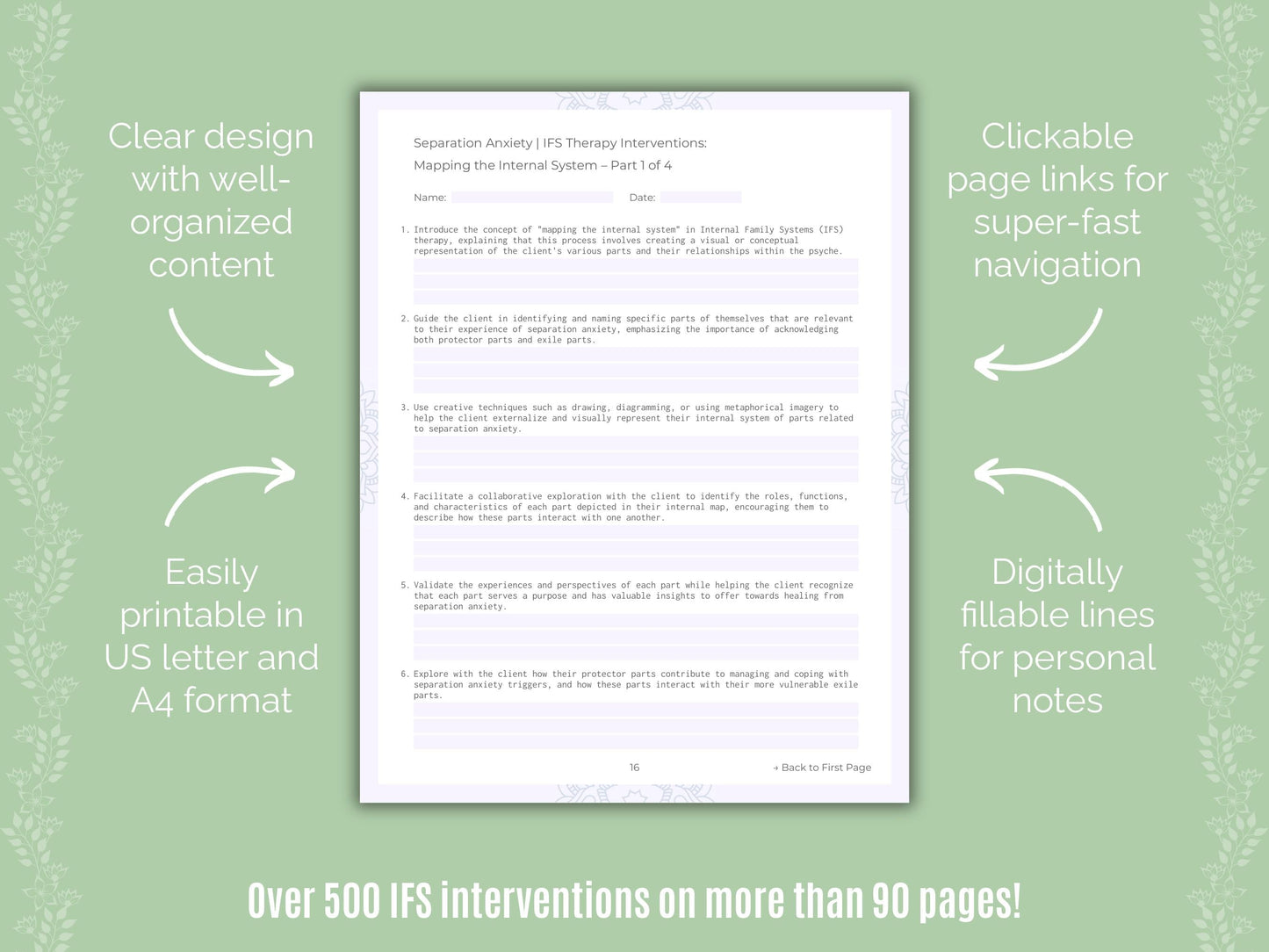 📚 Contains: One PDF workbook with over 500 internal family systems (IFS) therapy interventions for separation anxiety therapy in 22 sections, instantly downloadable in US letter and A4 size.