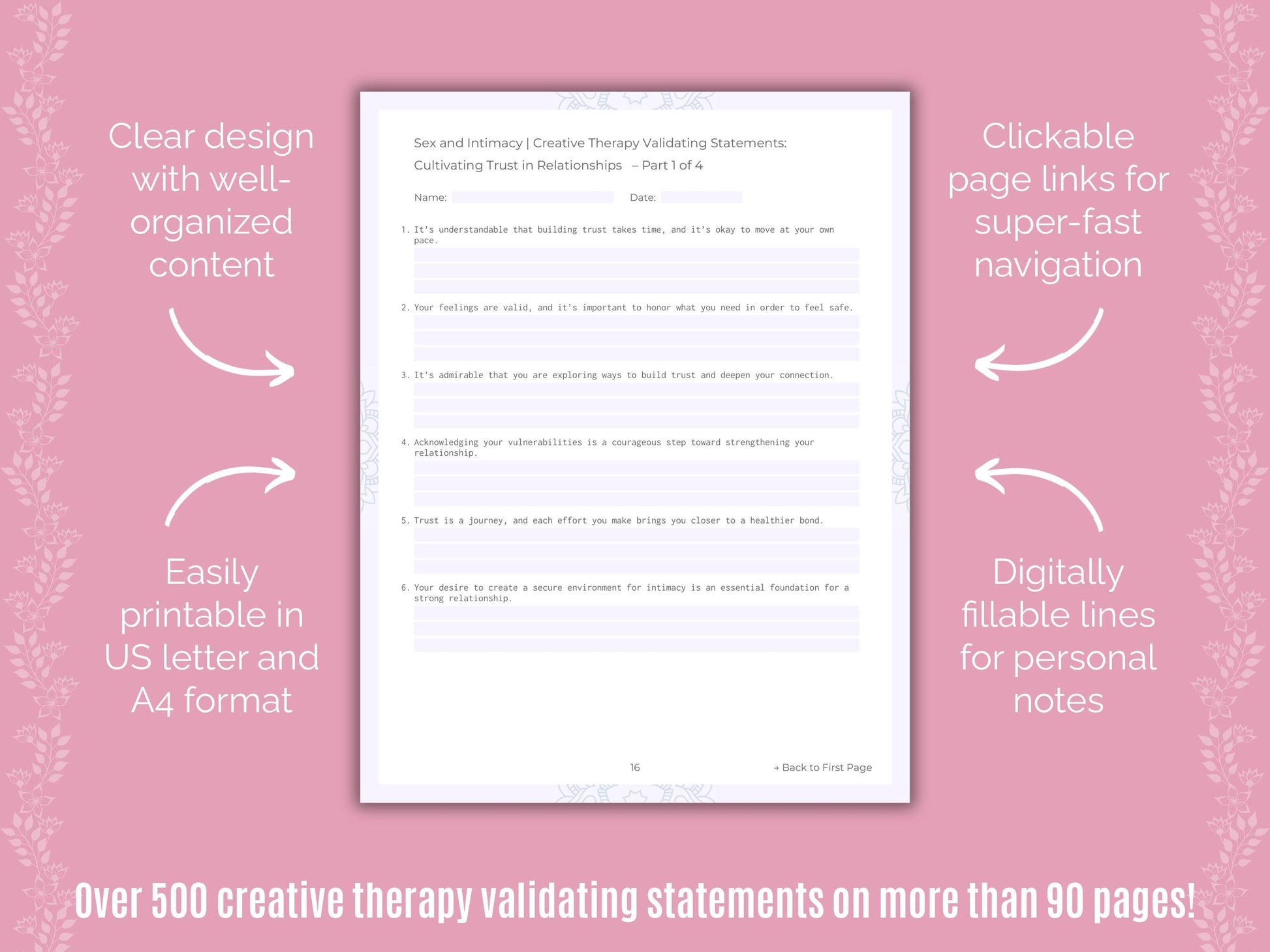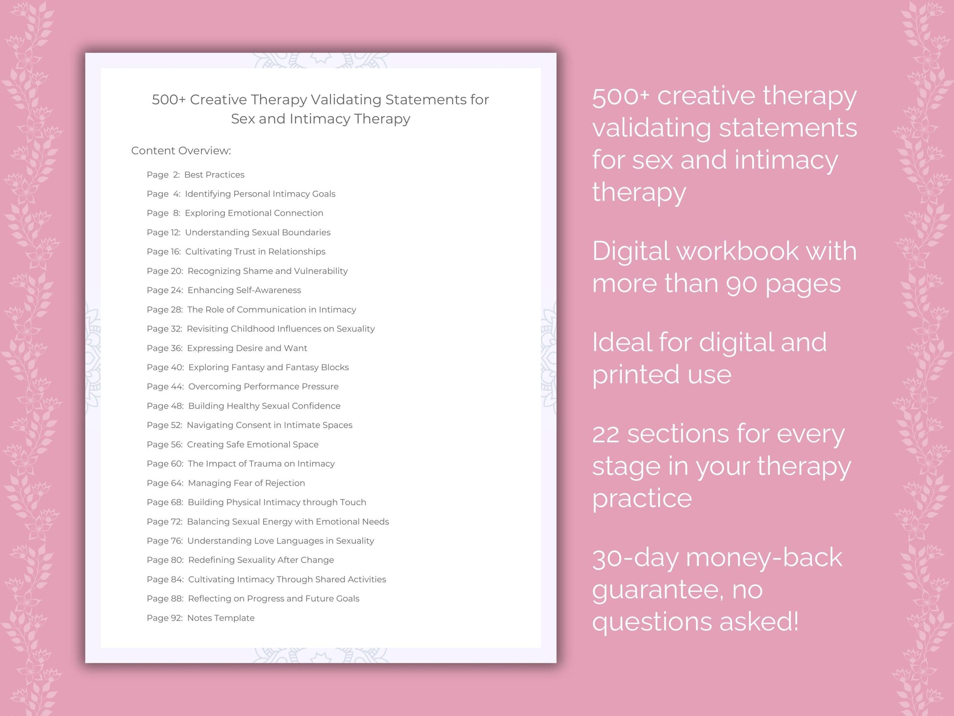 📚 Contains: One PDF workbook with over 500 creative therapy validating statements for sex and intimacy therapy in 22 sections, instantly downloadable in US letter and A4 size.