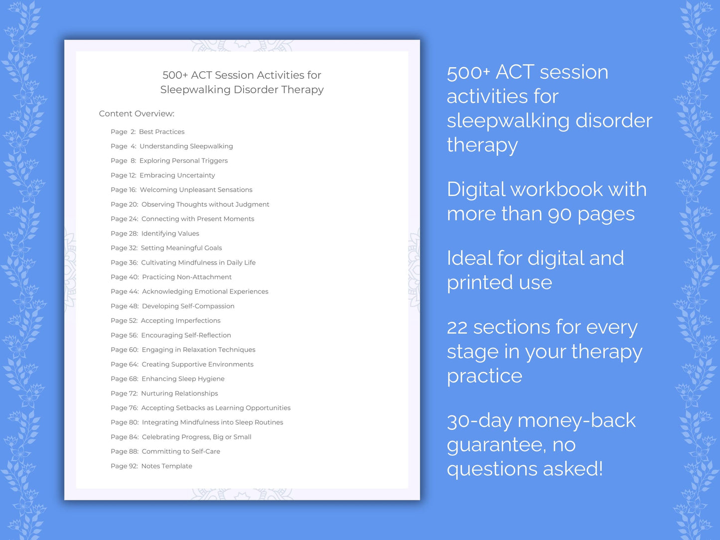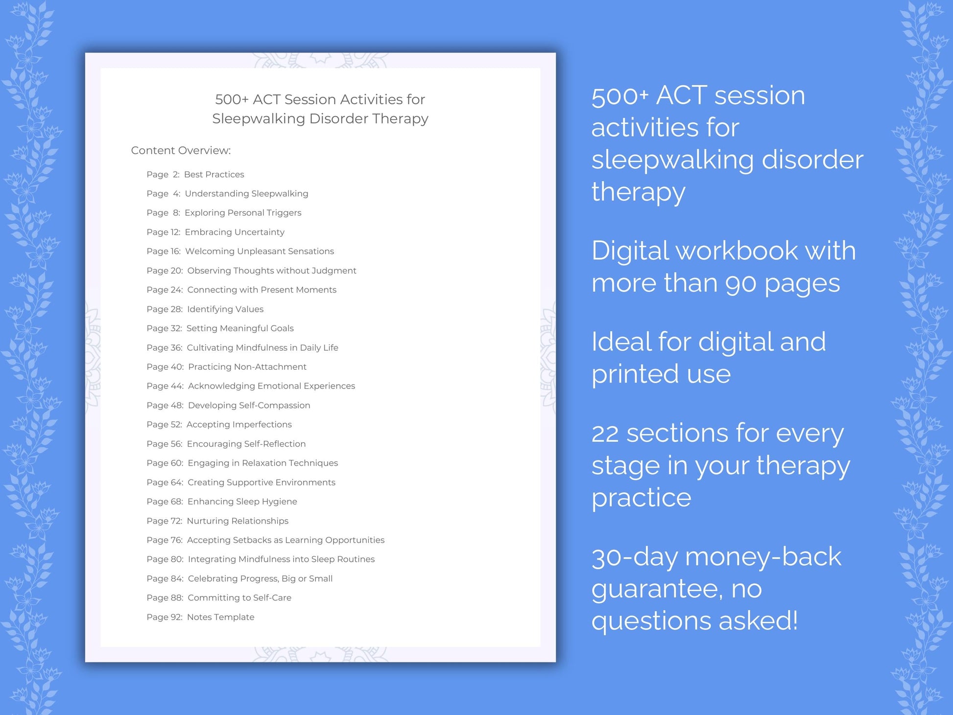 📚 Contains: One PDF workbook with over 500 acceptance and commitment therapy (ACT) session activities for sleepwalking disorder therapy in 22 sections, instantly downloadable in US letter and A4 size.