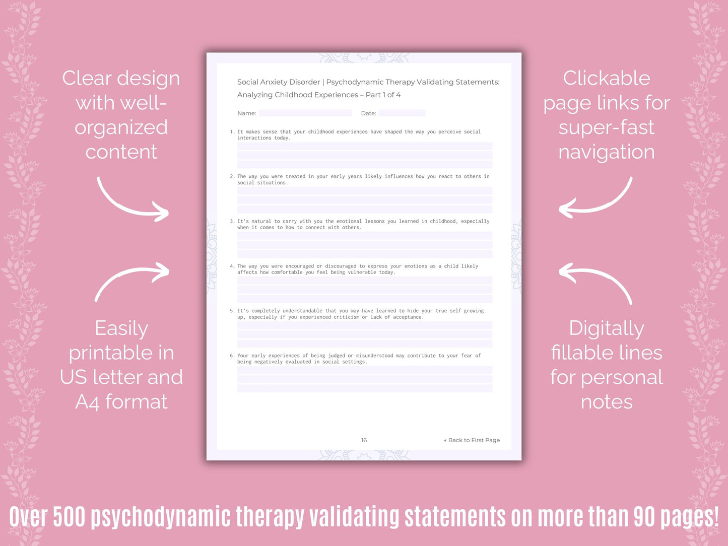📚 Contains: One PDF workbook with over 500 psychodynamic therapy validating statements for social anxiety disorder therapy in 22 sections, instantly downloadable in US letter and A4 size.