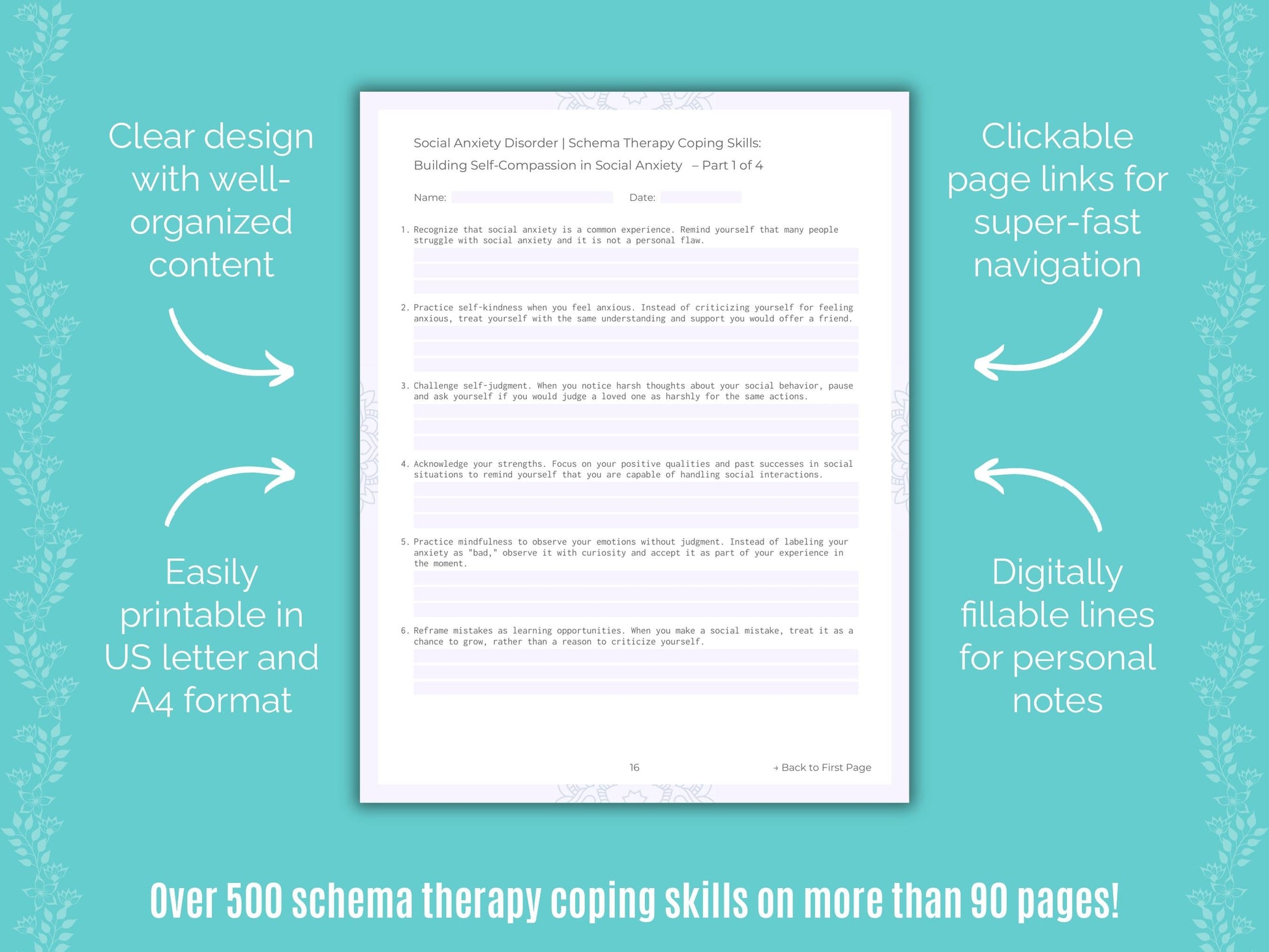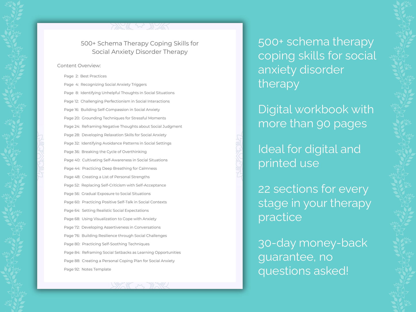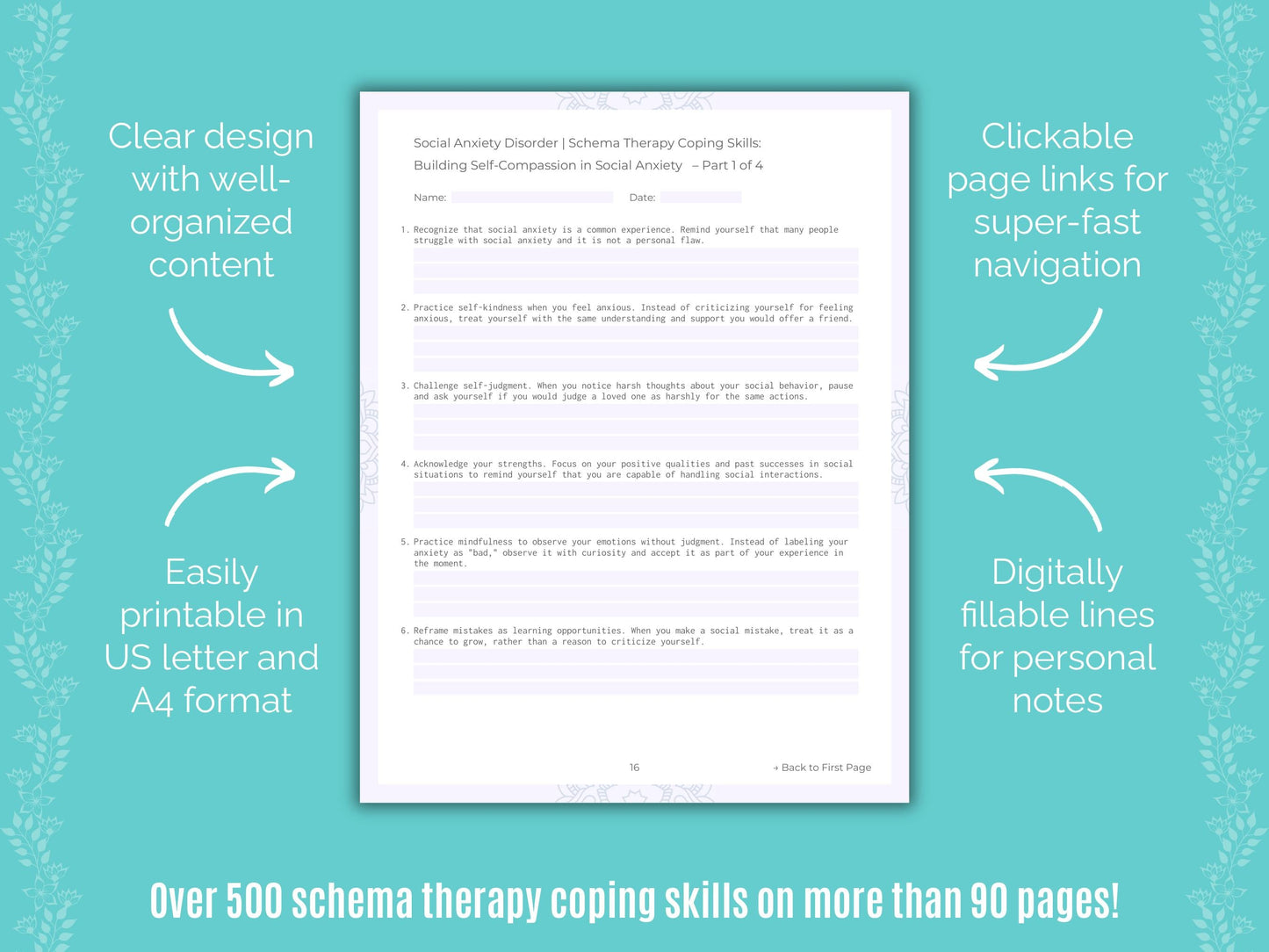 📚 Contains: One PDF workbook with over 500 schema therapy coping skills for social anxiety disorder therapy in 22 sections, instantly downloadable in US letter and A4 size.