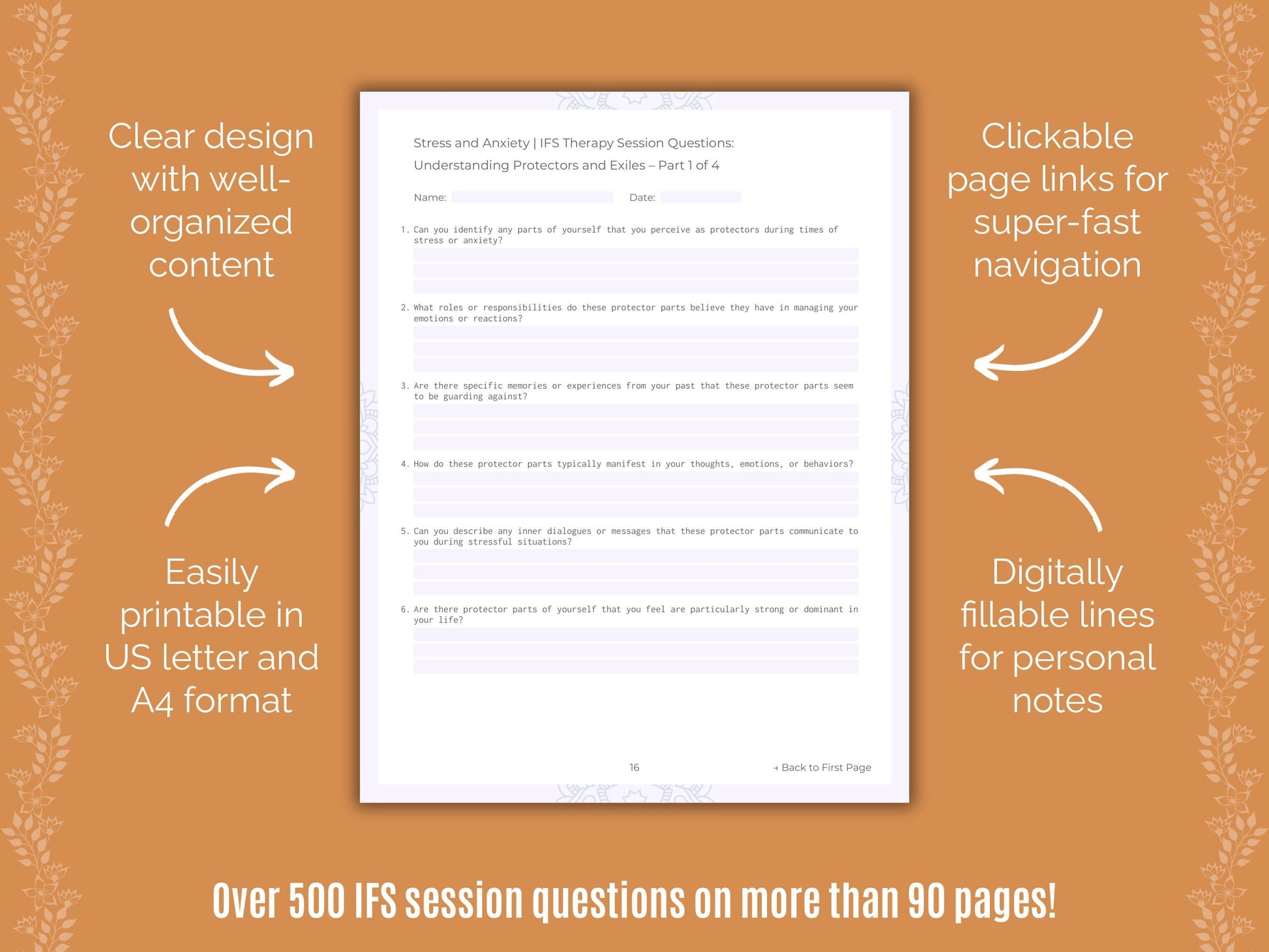 📚 Contains: One PDF workbook with over 500 internal family systems (IFS) therapy session questions for stress and anxiety therapy in 22 sections, instantly downloadable in US letter and A4 size.